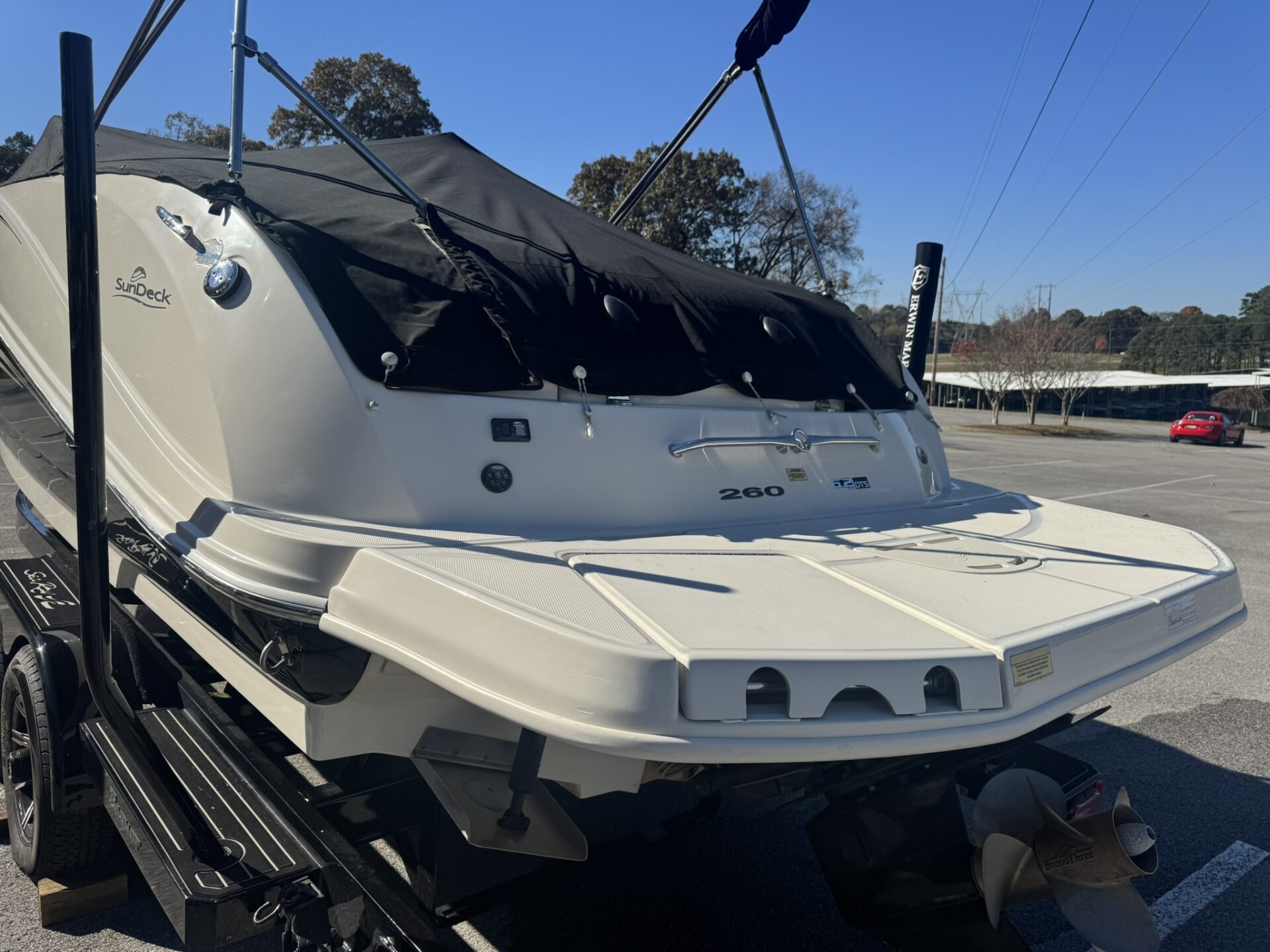 This is a loaded One Owner Lift Kept 260SD that has always been undercover on the TN River. It has only 165 hours on a Mercruiser 6.2l MPI Bravo III (320php) and is equipped with Bimini Top; Cockpit & Bow covers; Vacuflush Head System; Docking Lights; Transom Trim Switch; Forward Cockpit Table; Sunpad Filler Cushion; Polk Premier Stereo Upgrade; Thigh Rise Bolster Bucket Seats. NO TRAILER!!