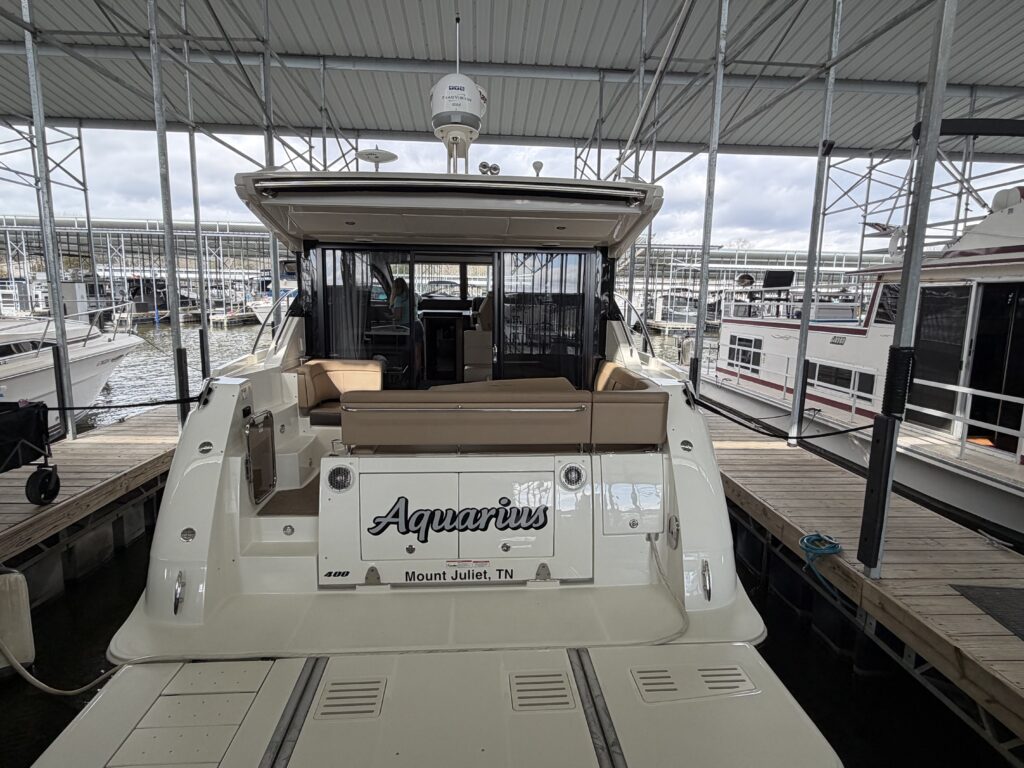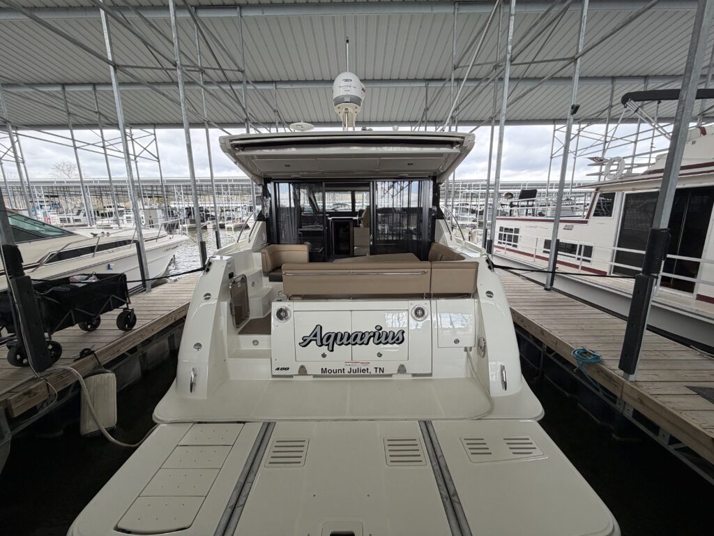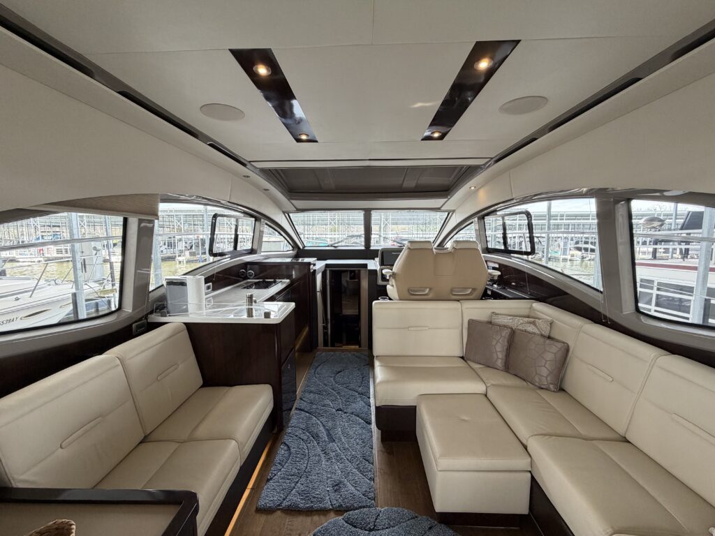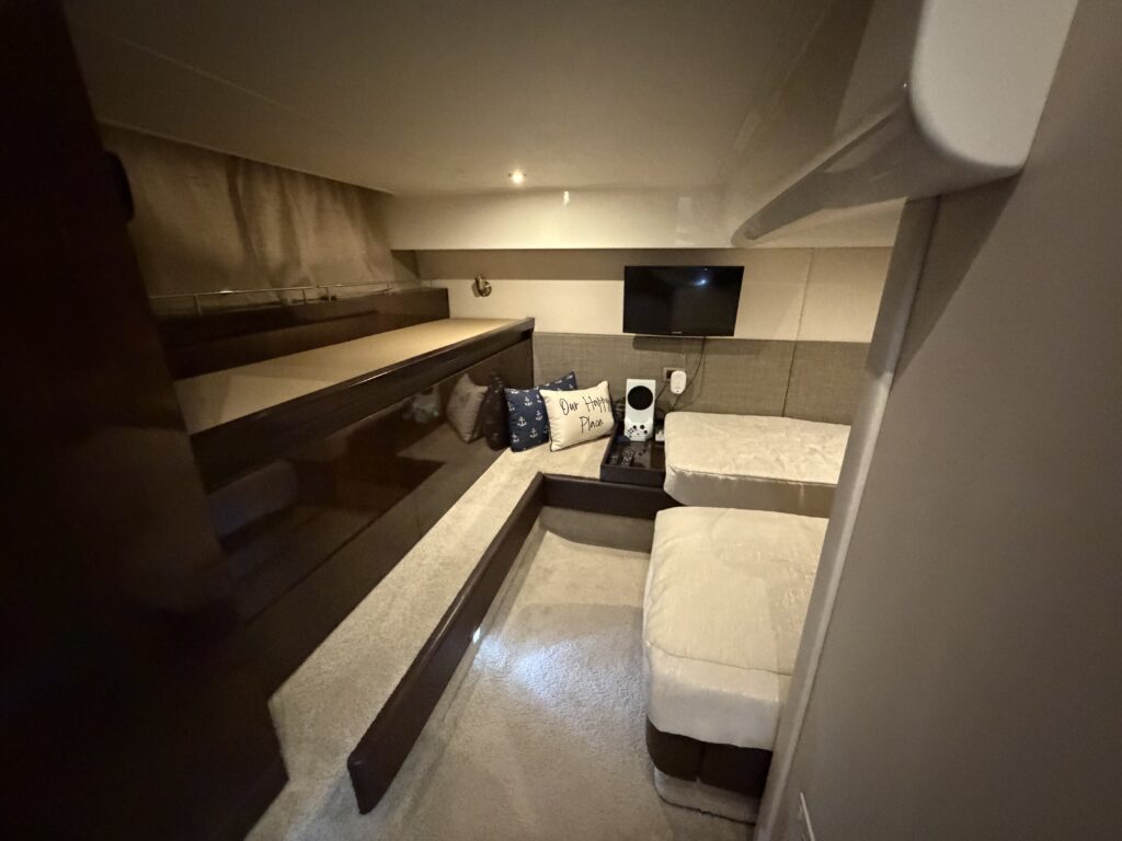 It’s a white hull with black canvas, Aft Isinglass Enclosure, Inverter System, Foredeck Audio, Windlass with SS anchor, Hydraulic Swim Platform, Electric Cockpit Awning, Mesh Windshield Shades, Custom Cockpit Refrigerator, Teak Cockpit Table, Bow Thruster, Inboard Joystick Docking System, Interior Stereo Upgrade, Dynamic Running Surface, Cockpit Cool Box, Underwater Lights, DSS Satellite System, Oil Change System, Fuel Transfer Pump, Factory Storage Cabinet in Aft Stateroom, Single Head Layout, TV’s in both Staterooms & Salon, Twin Raymarine Radar/Chart Screens, and U.S. Flag & SS base.