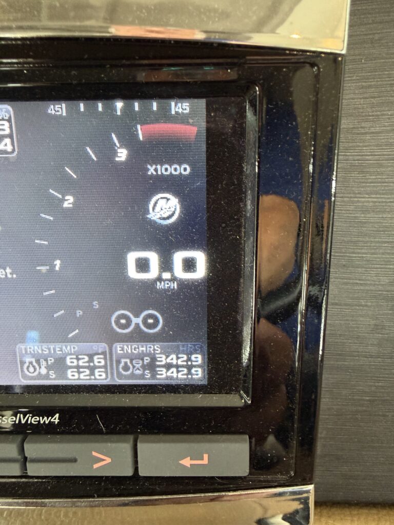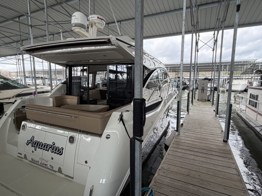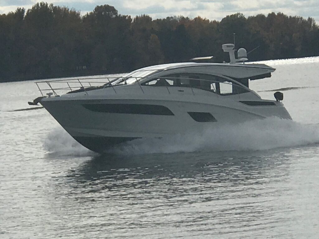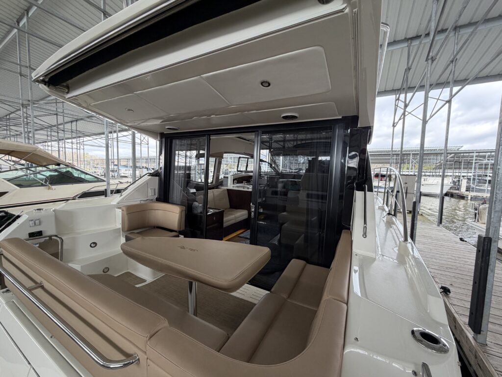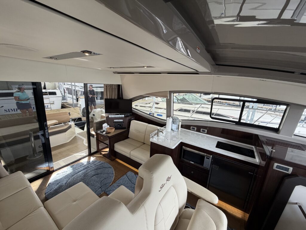 It’s a white hull with black canvas, Aft Isinglass Enclosure, Inverter System, Foredeck Audio, Windlass with SS anchor, Hydraulic Swim Platform, Electric Cockpit Awning, Mesh Windshield Shades, Custom Cockpit Refrigerator, Teak Cockpit Table, Bow Thruster, Inboard Joystick Docking System, Interior Stereo Upgrade, Dynamic Running Surface, Cockpit Cool Box, Underwater Lights, DSS Satellite System, Oil Change System, Fuel Transfer Pump, Factory Storage Cabinet in Aft Stateroom, Single Head Layout, TV’s in both Staterooms & Salon, Twin Raymarine Radar/Chart Screens, and U.S. Flag & SS base.