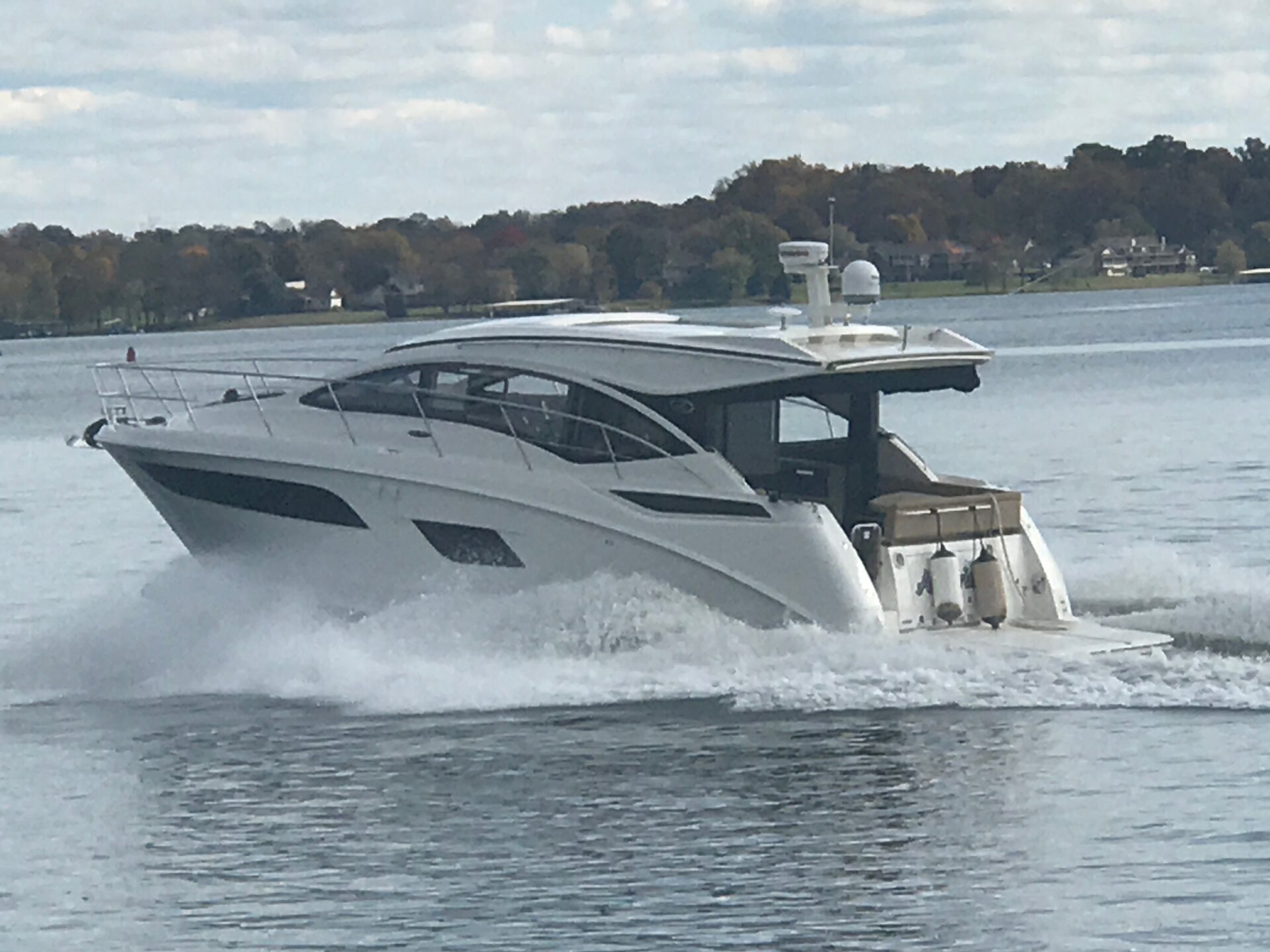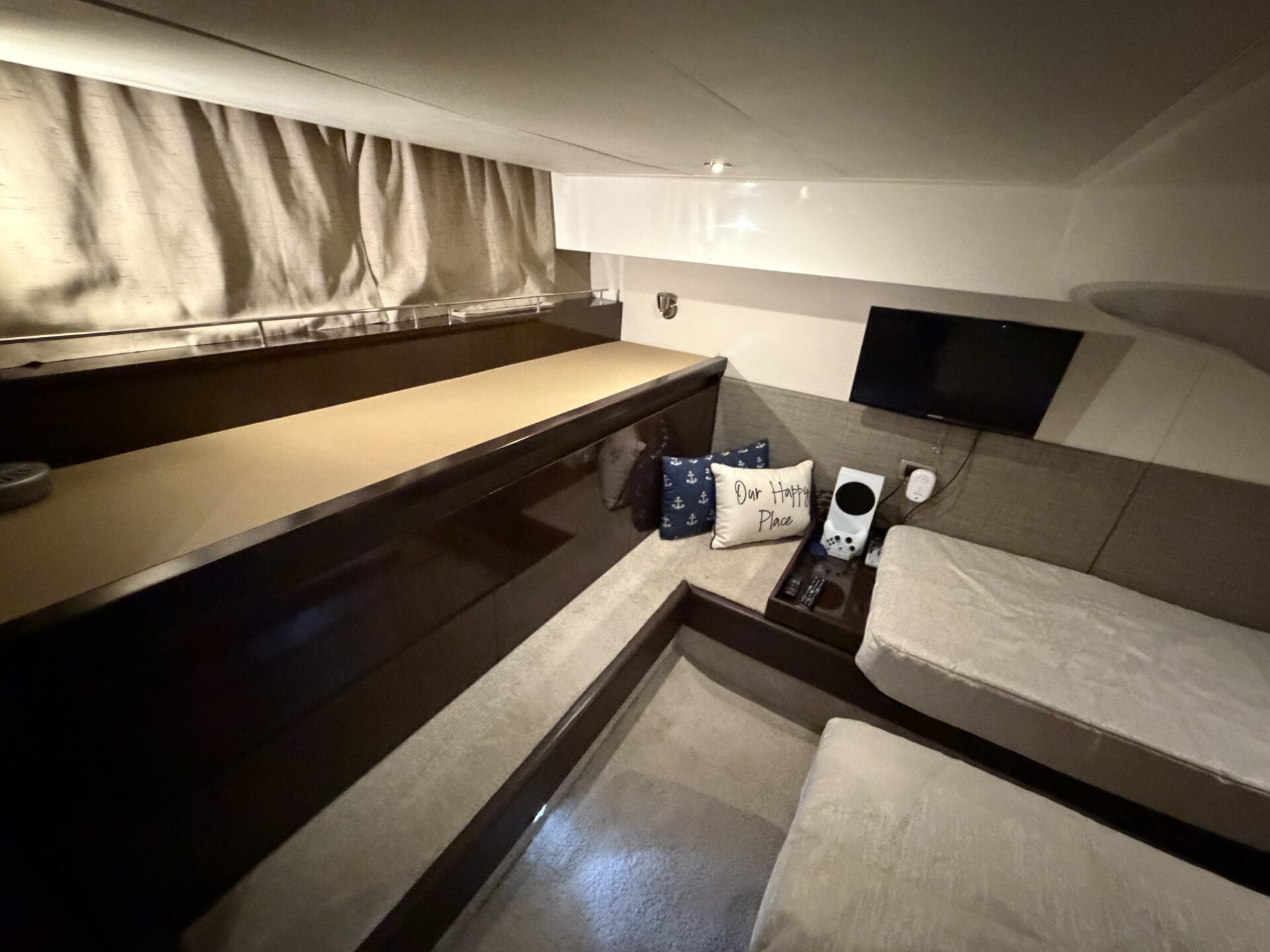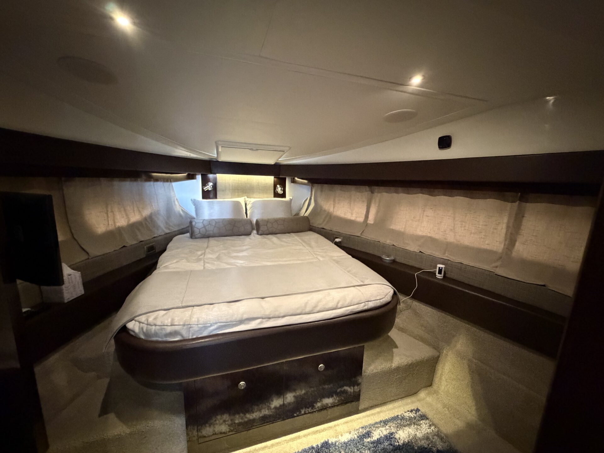 It’s a white hull with black canvas, Aft Isinglass Enclosure, Inverter System, Foredeck Audio, Windlass with SS anchor, Hydraulic Swim Platform, Electric Cockpit Awning, Mesh Windshield Shades, Custom Cockpit Refrigerator, Teak Cockpit Table, Bow Thruster, Inboard Joystick Docking System, Interior Stereo Upgrade, Dynamic Running Surface, Cockpit Cool Box, Underwater Lights, DSS Satellite System, Oil Change System, Fuel Transfer Pump, Factory Storage Cabinet in Aft Stateroom, Single Head Layout, TV’s in both Staterooms & Salon, Twin Raymarine Radar/Chart Screens, and U.S. Flag & SS base.