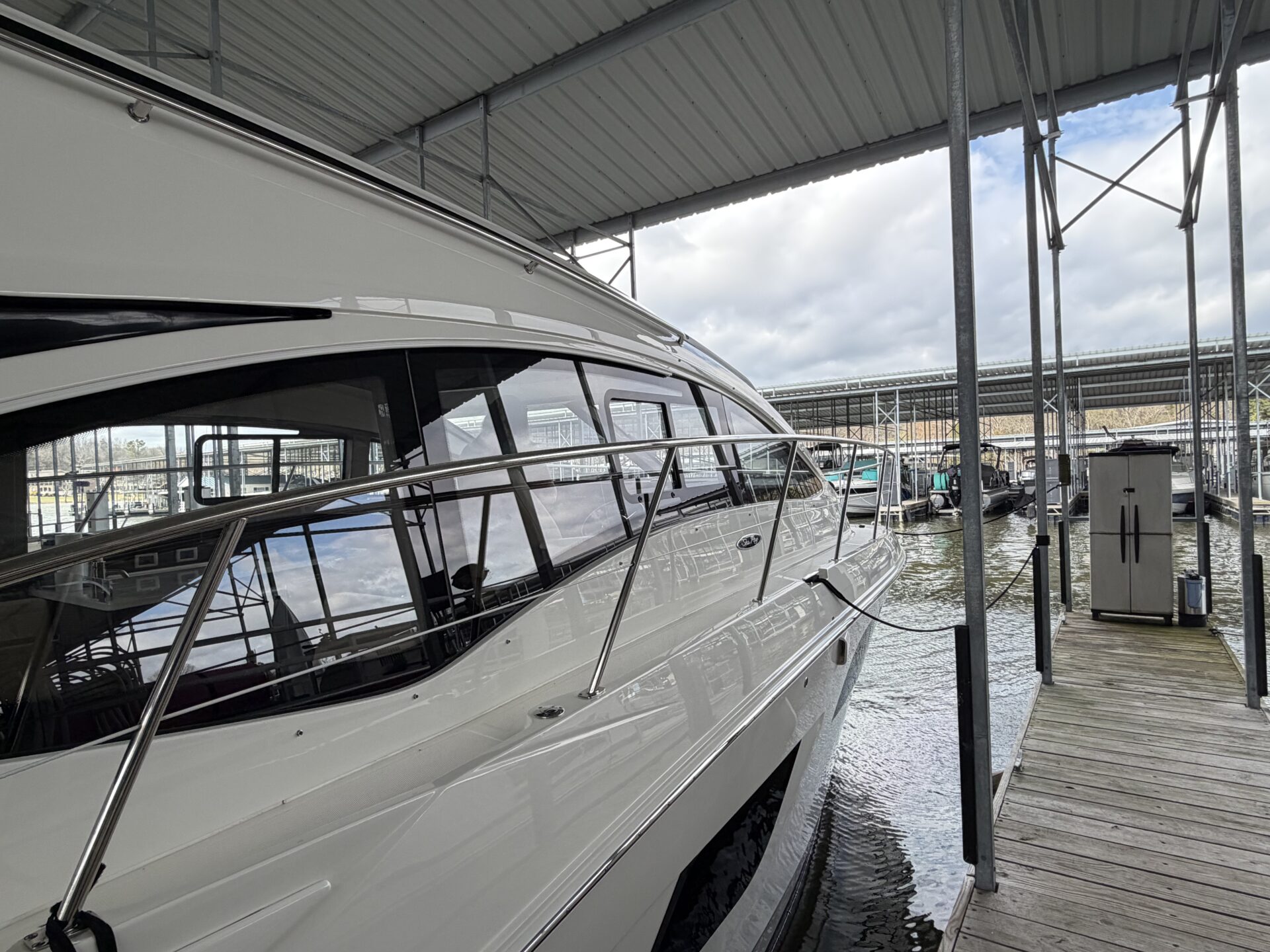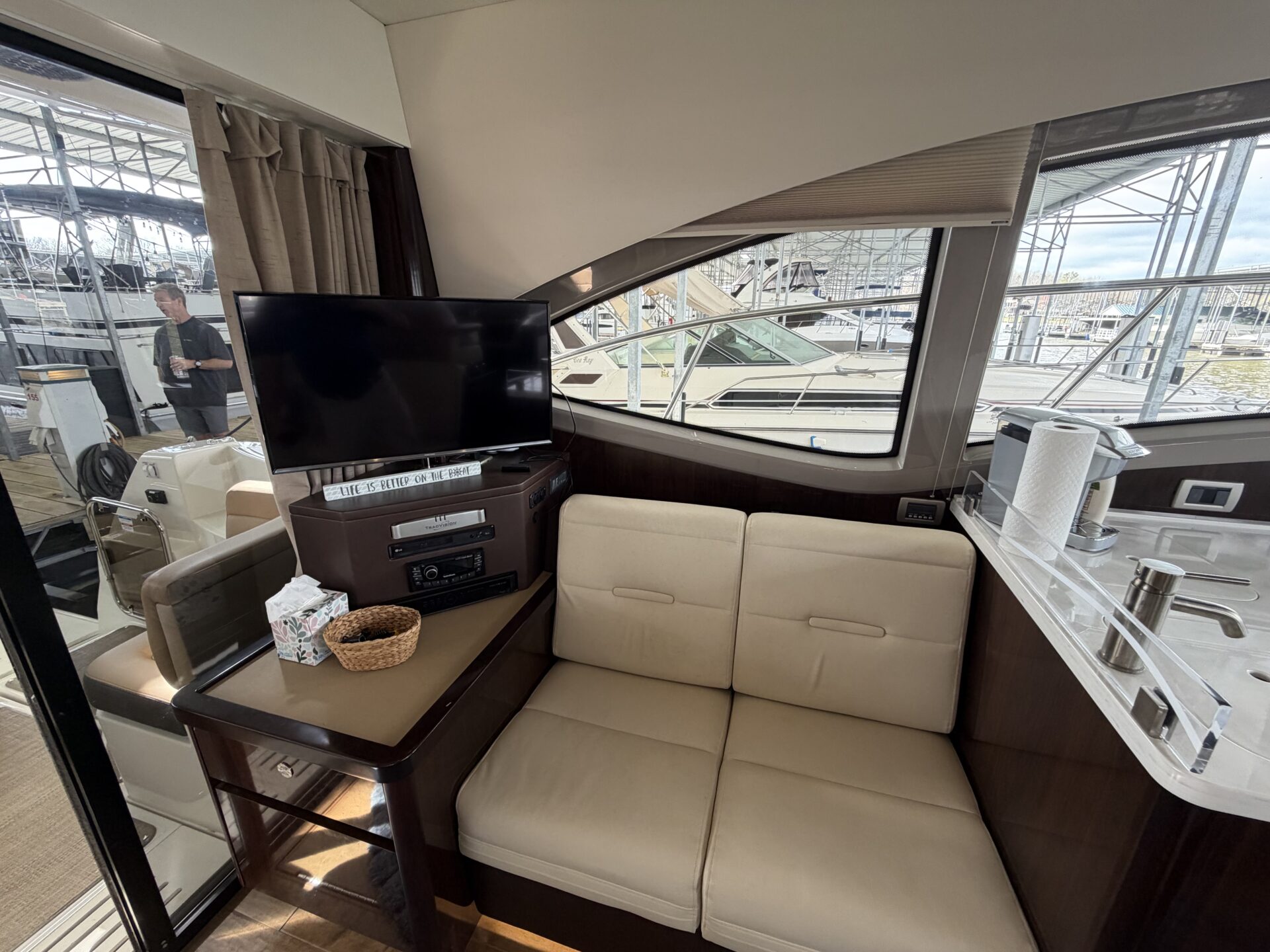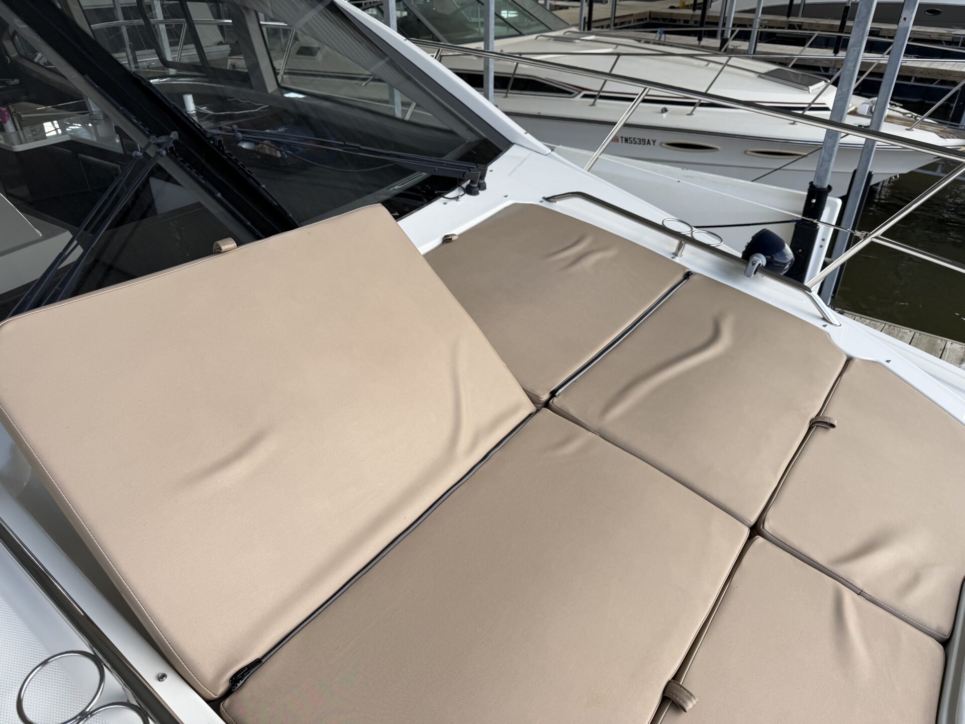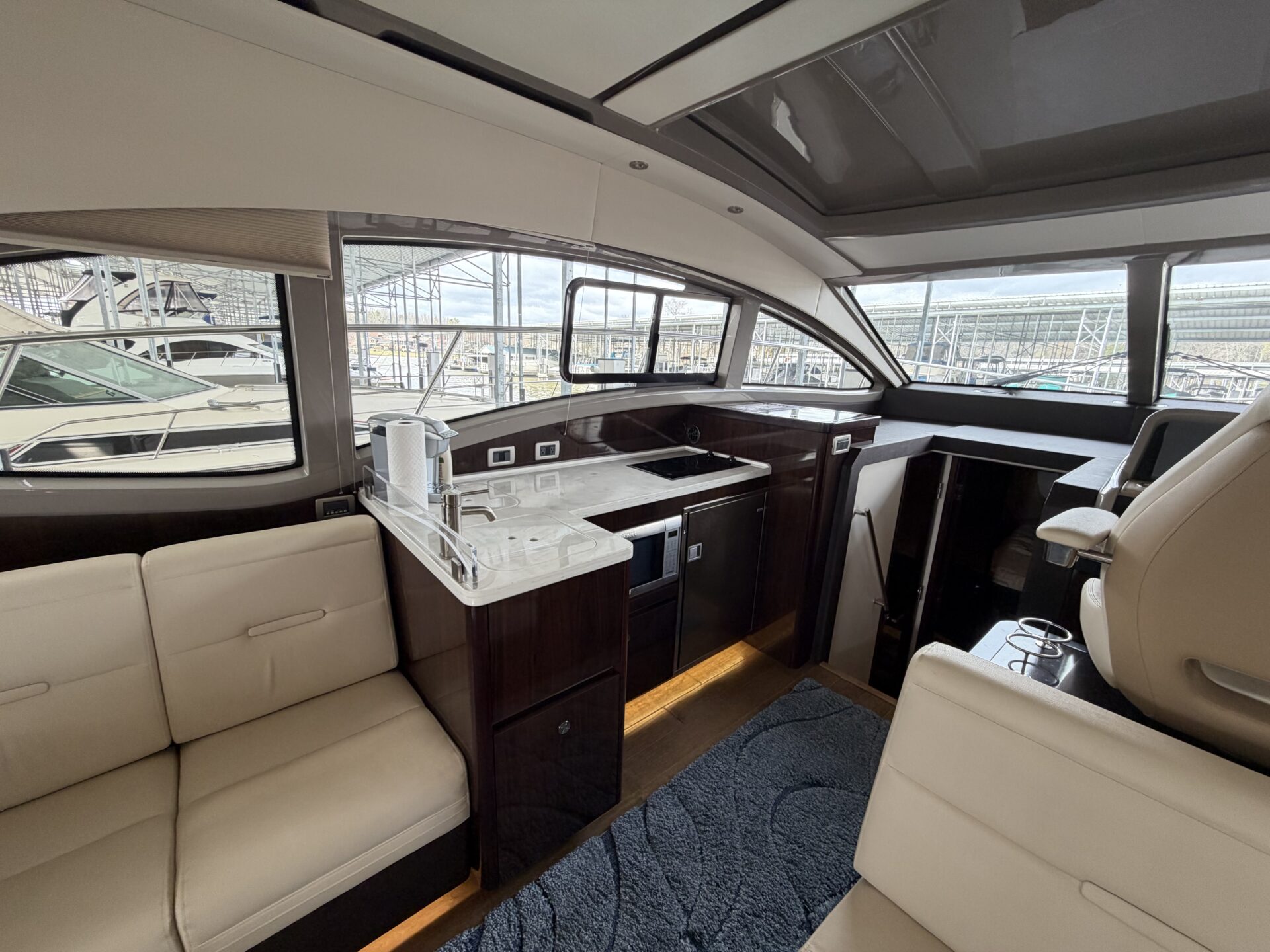 It’s a white hull with black canvas, Aft Isinglass Enclosure, Inverter System, Foredeck Audio, Windlass with SS anchor, Hydraulic Swim Platform, Electric Cockpit Awning, Mesh Windshield Shades, Custom Cockpit Refrigerator, Teak Cockpit Table, Bow Thruster, Inboard Joystick Docking System, Interior Stereo Upgrade, Dynamic Running Surface, Cockpit Cool Box, Underwater Lights, DSS Satellite System, Oil Change System, Fuel Transfer Pump, Factory Storage Cabinet in Aft Stateroom, Single Head Layout, TV’s in both Staterooms & Salon, Twin Raymarine Radar/Chart Screens, and U.S. Flag & SS base.