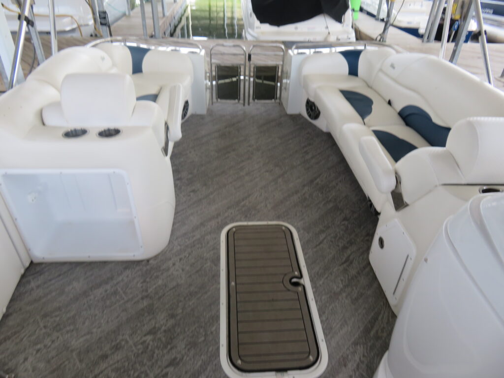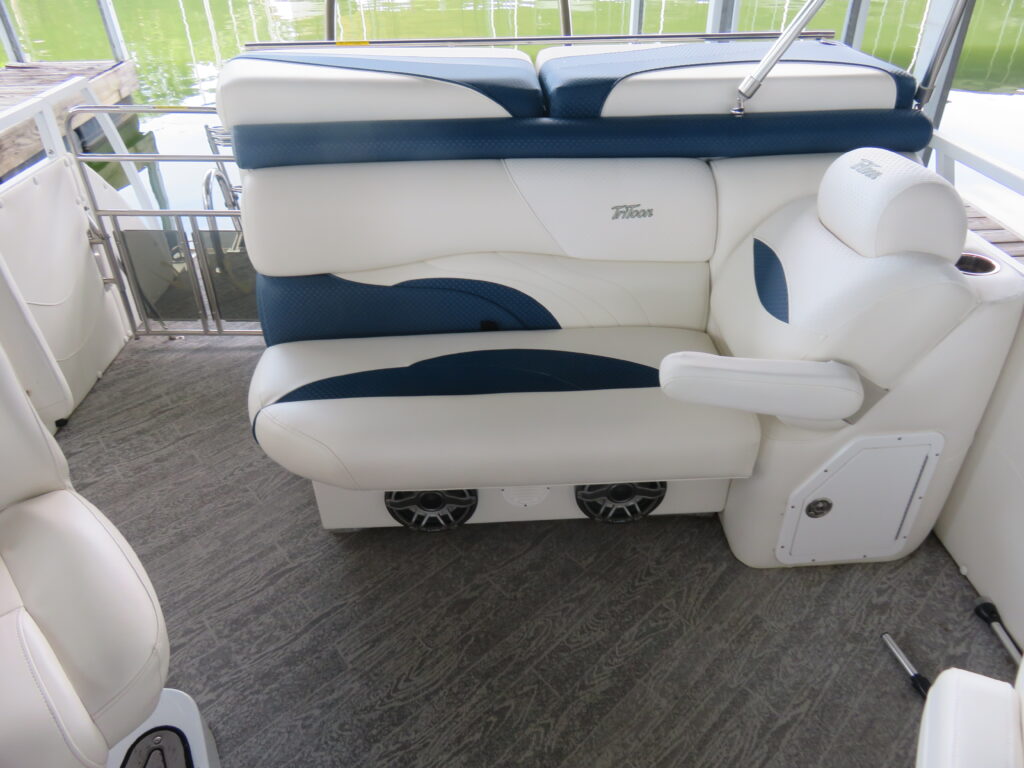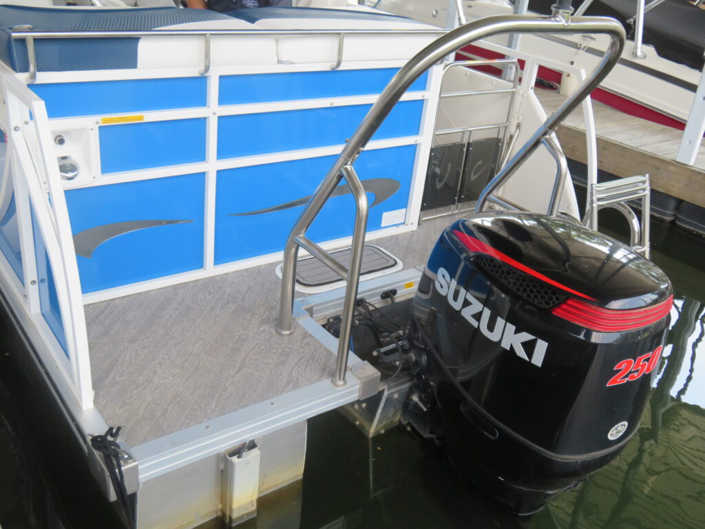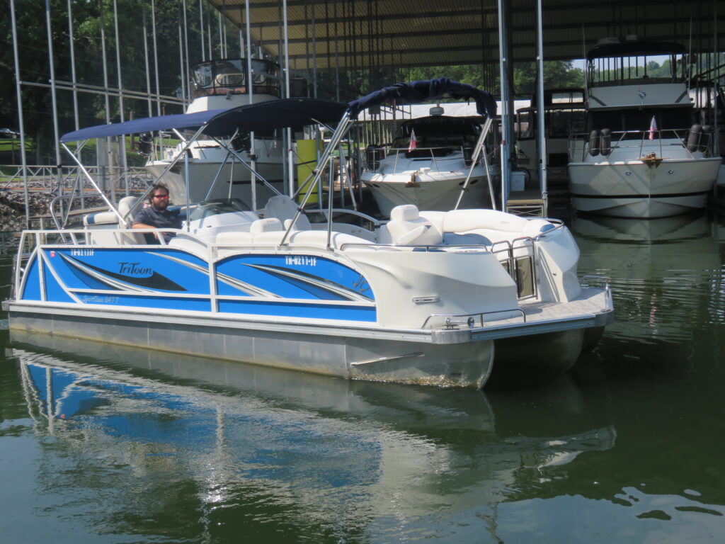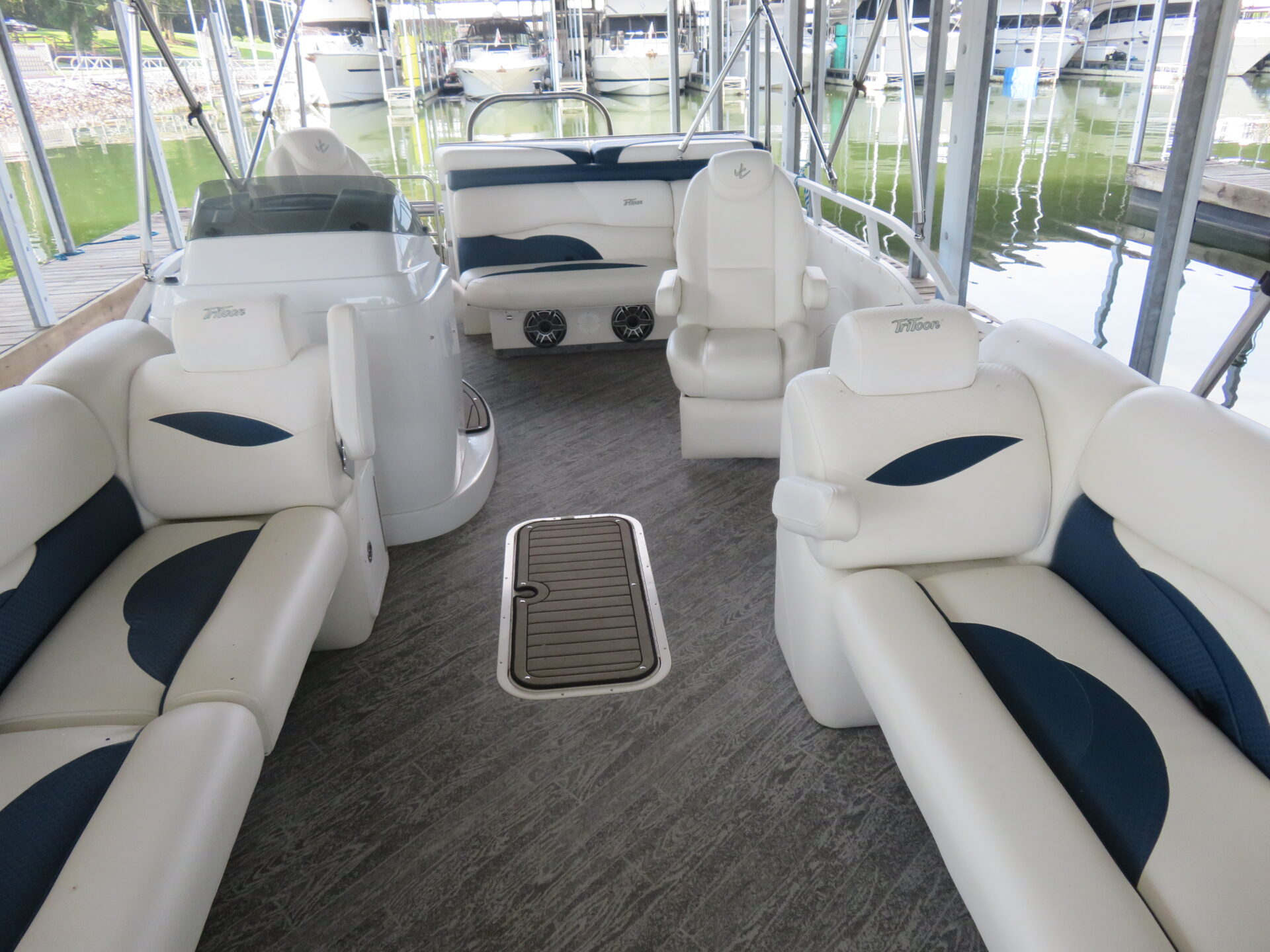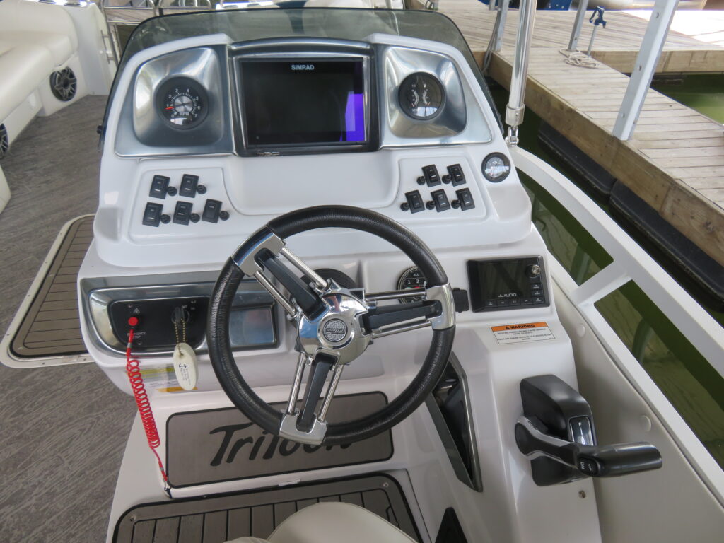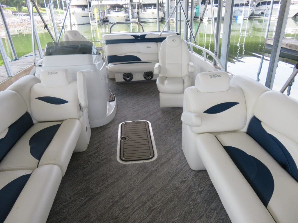 This is a loaded Luxury Tritoon with only 245 hours on a Suzuki 250 hp V-6 4 Stroke. It is loaded with Double Bimini Top; Upgraded JL Stereo; Simrad 12″ Plotter/Gps/Depth Finder; Dual Batteries with Switch; Docking Lights; Infinity Flooring; In Floor Storage; Ski Tow Bar; Cooler Storage; Changing Room; NO TRAILER!!