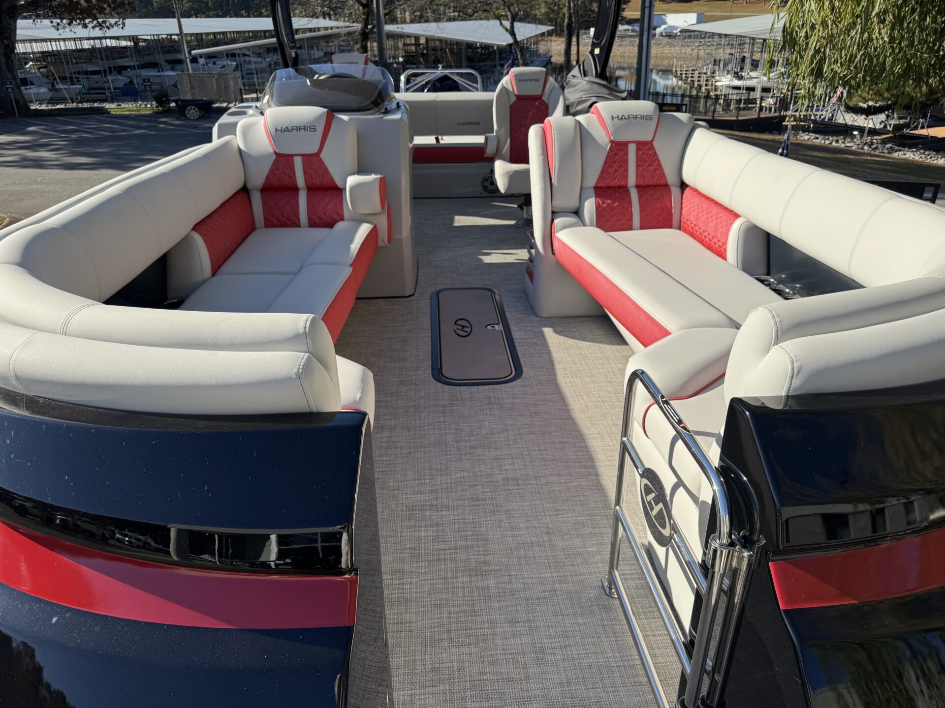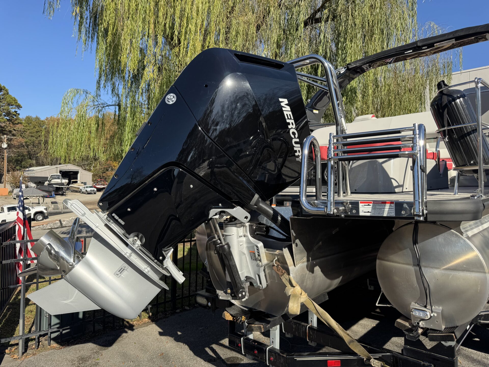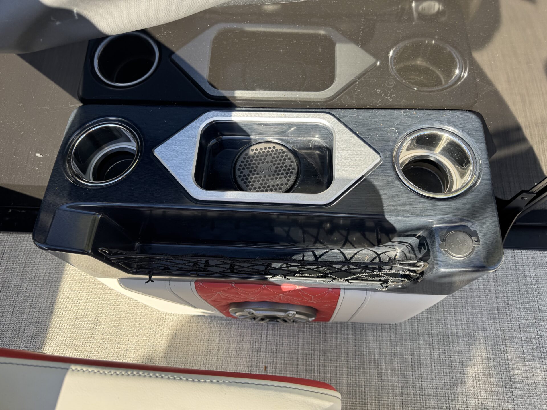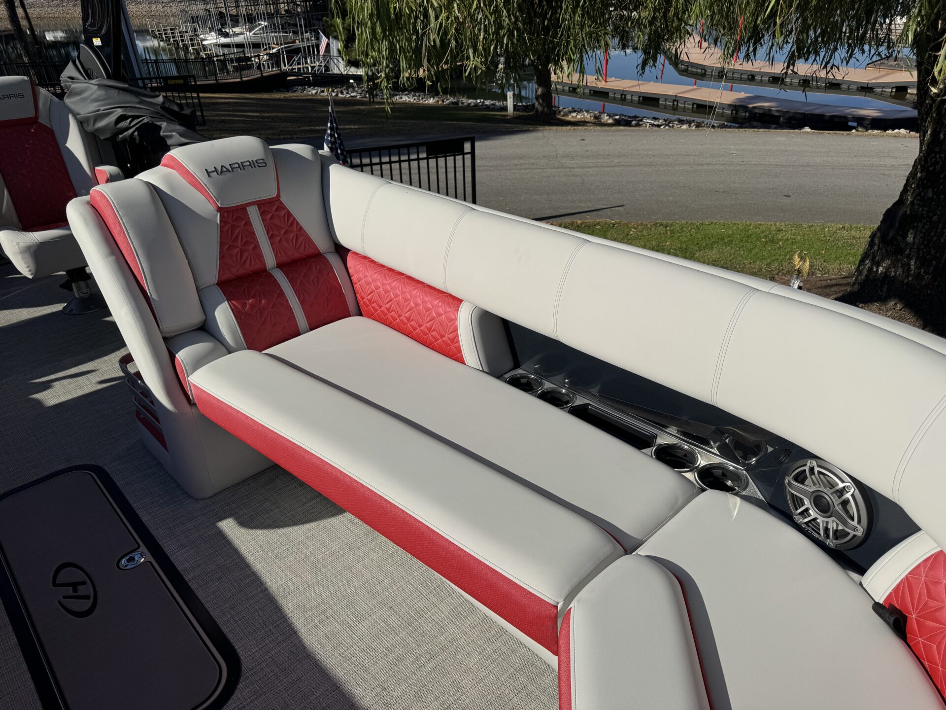 Black Sapphire Fencing with Blush Red Accent; Black Rail Package; SLDH Layout; Moonlight Gray Pillowtop with Crimson Accent; 350l V-10 Mercury; 325 Chassis with 25″ Outside Pontoons and 27″ Center Pontoon; Center Floor Storage; SS Ski Tow Bar; ION Power Lift Tower with Black Bimini Top; Total Light Package with *C-Zone*; Convenience Package; 4 Step Telescoping Swim Ladder; Sterling Gray Woven Vinyl Flooring; SIMRAD NSX9 Glass Dash Screen; Raised Helm; Removable Windscreen; JL Platinum Stereo Upgrade with 8 Speakers & 2 AMPS/SUBS; Canvas individual Seat Covers; Woodgrain Table.