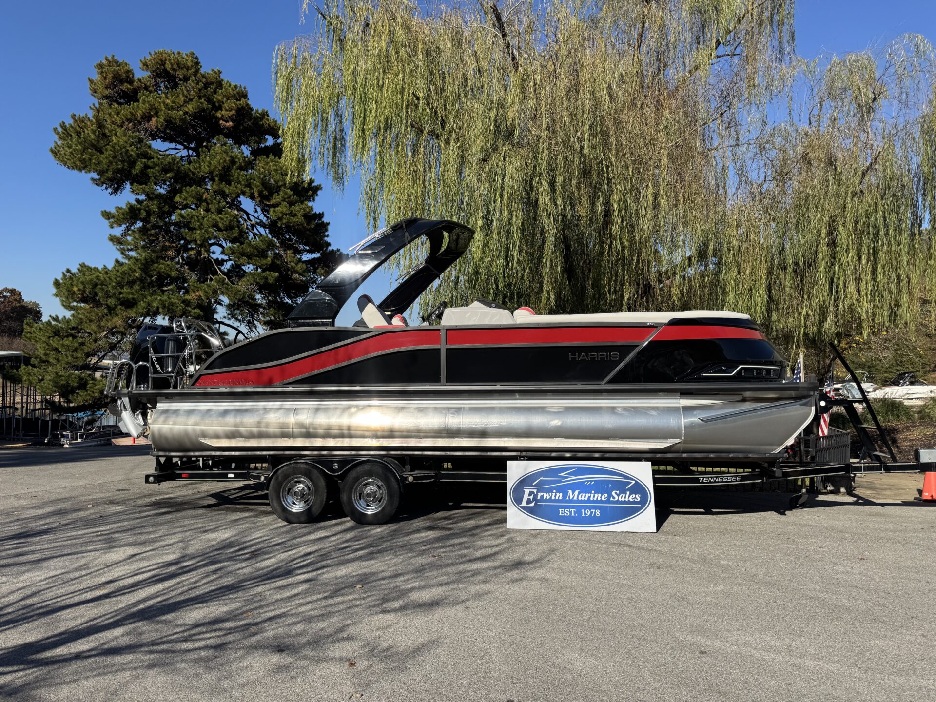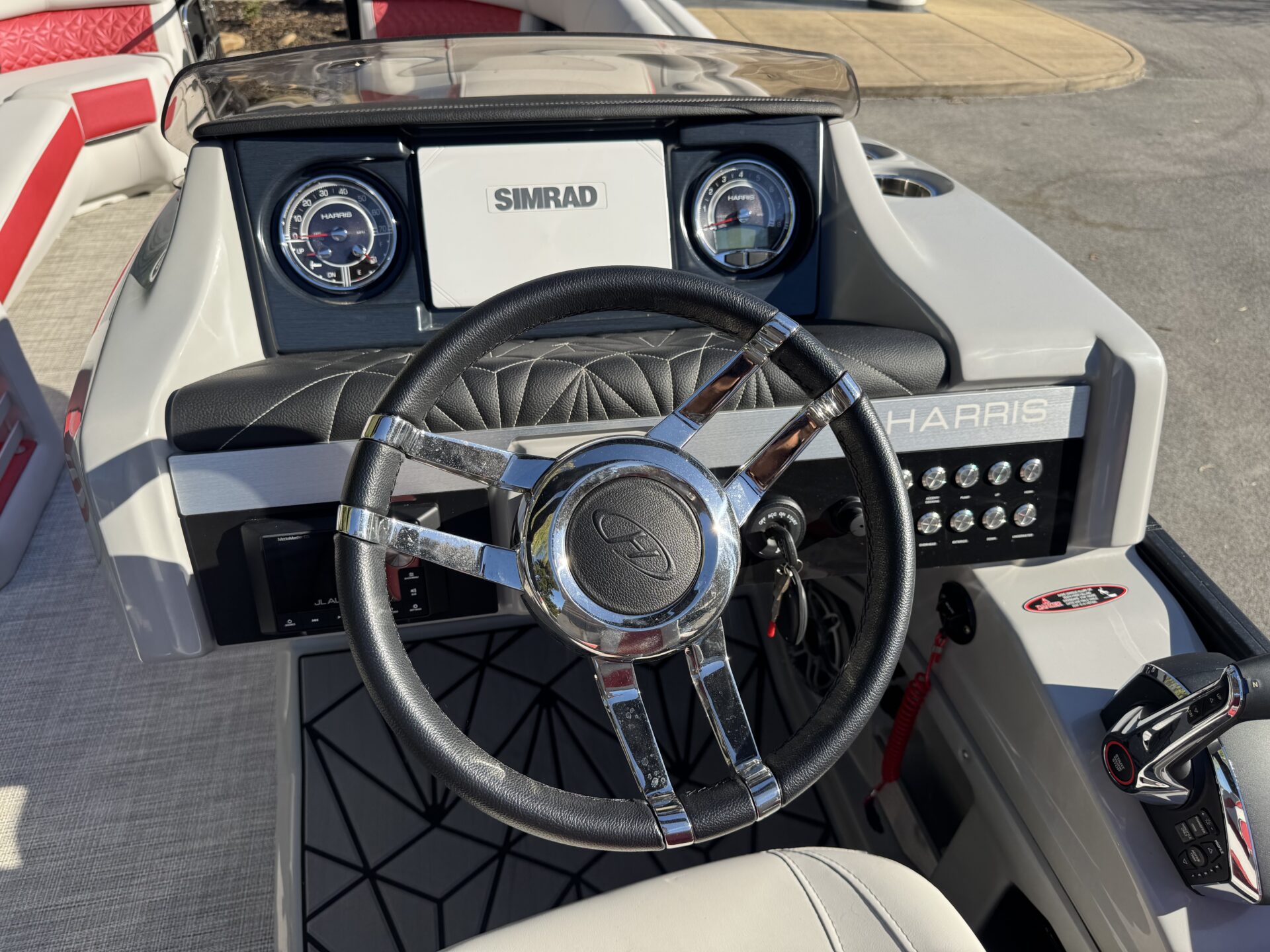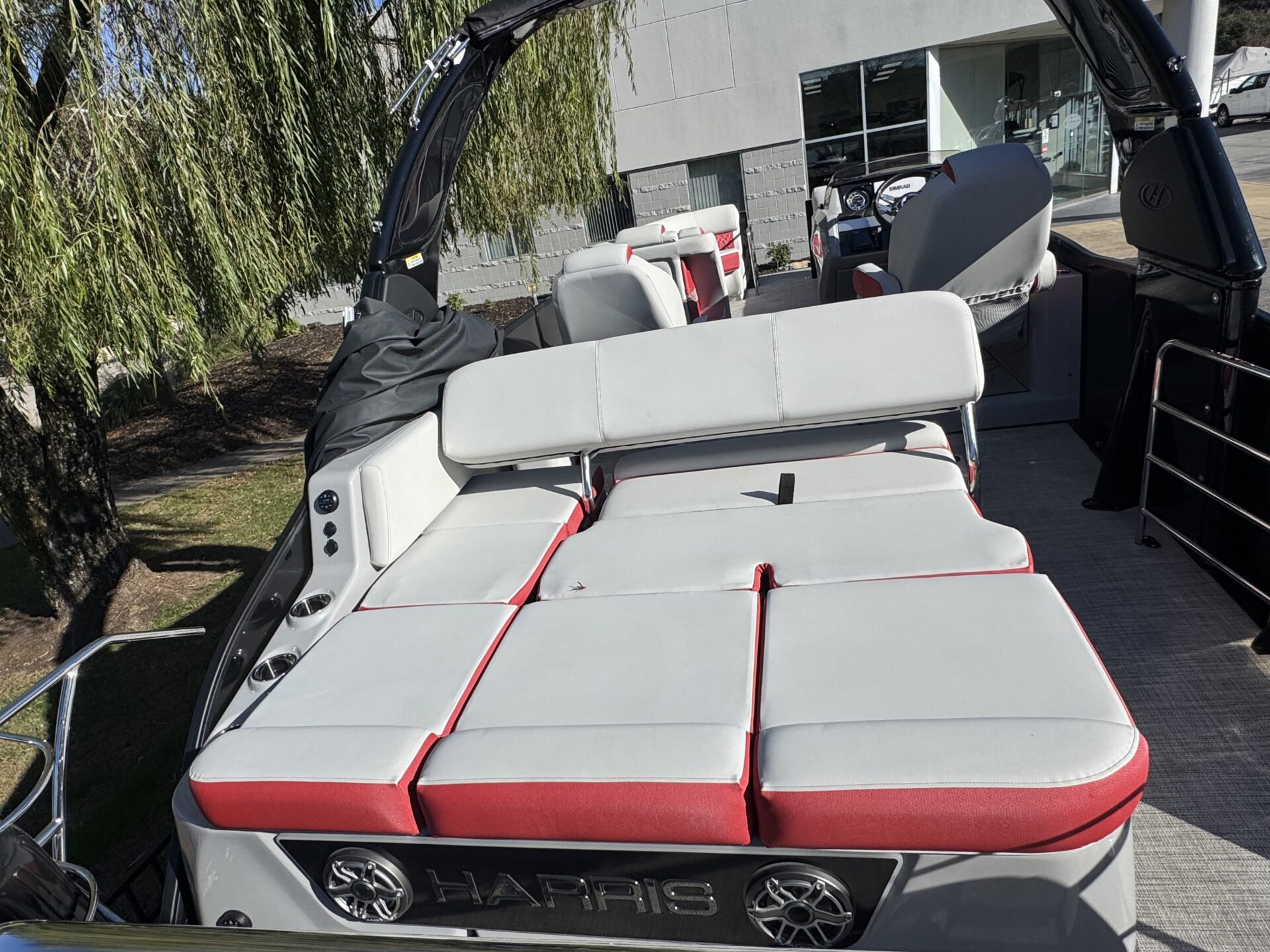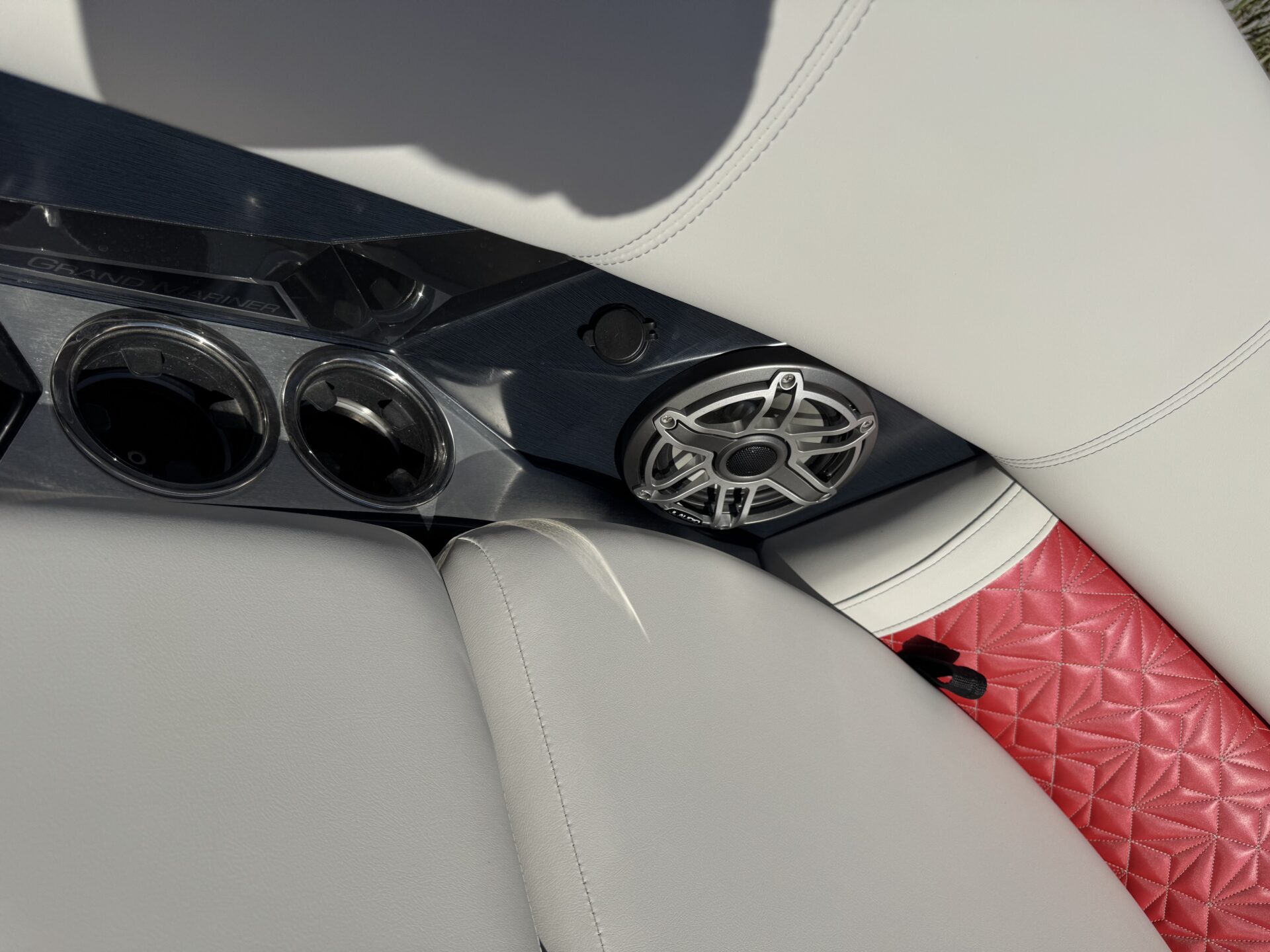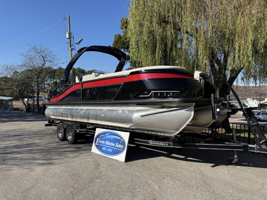 Black Sapphire Fencing with Blush Red Accent; Black Rail Package; SLDH Layout; Moonlight Gray Pillowtop with Crimson Accent; 350l V-10 Mercury; 325 Chassis with 25″ Outside Pontoons and 27″ Center Pontoon; Center Floor Storage; SS Ski Tow Bar; ION Power Lift Tower with Black Bimini Top; Total Light Package with *C-Zone*; Convenience Package; 4 Step Telescoping Swim Ladder; Sterling Gray Woven Vinyl Flooring; SIMRAD NSX9 Glass Dash Screen; Raised Helm; Removable Windscreen; JL Platinum Stereo Upgrade with 8 Speakers & 2 AMPS/SUBS; Canvas individual Seat Covers; Woodgrain Table.