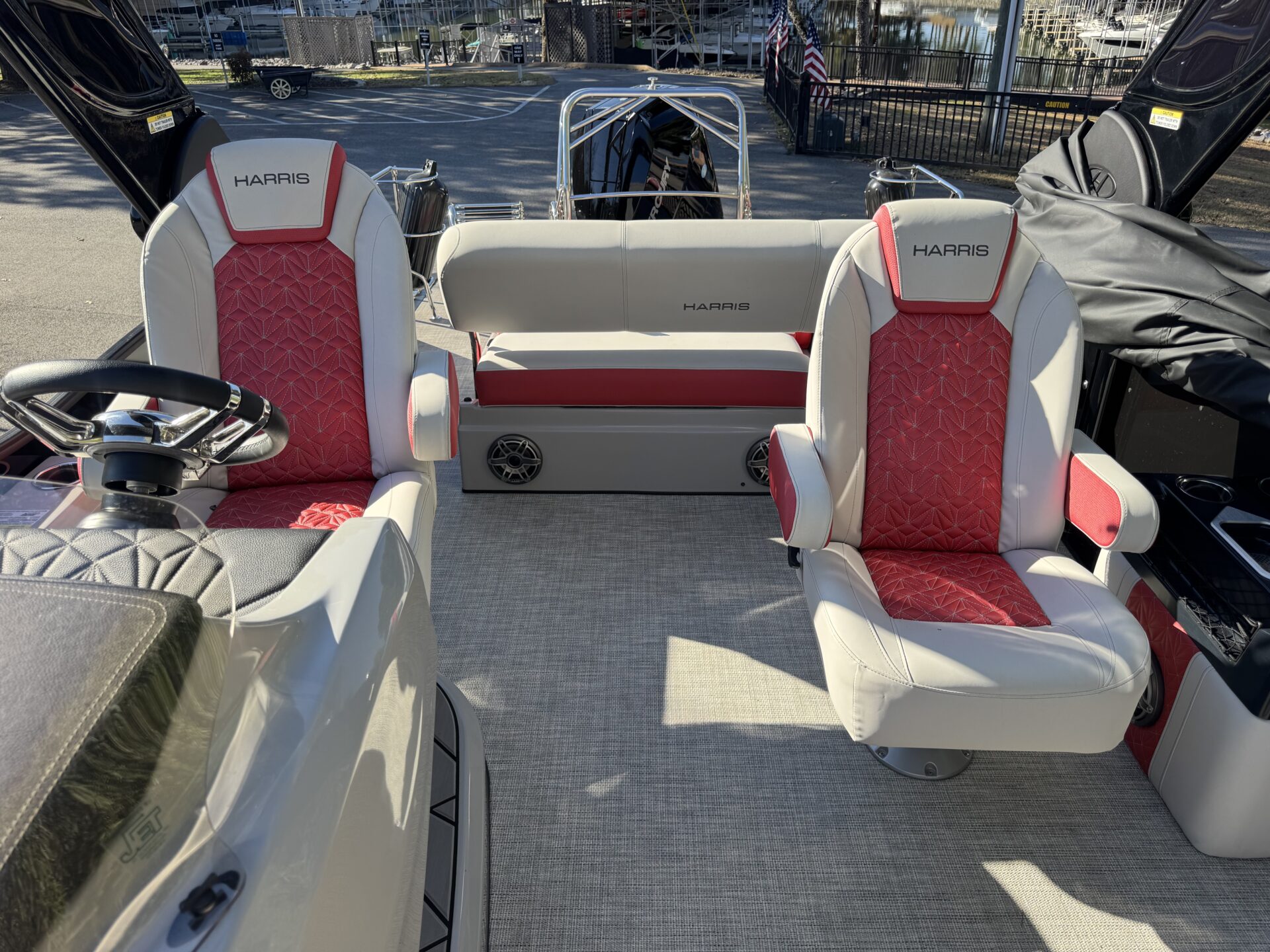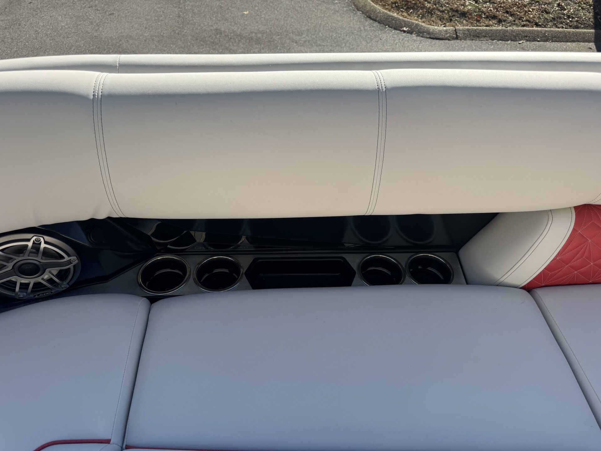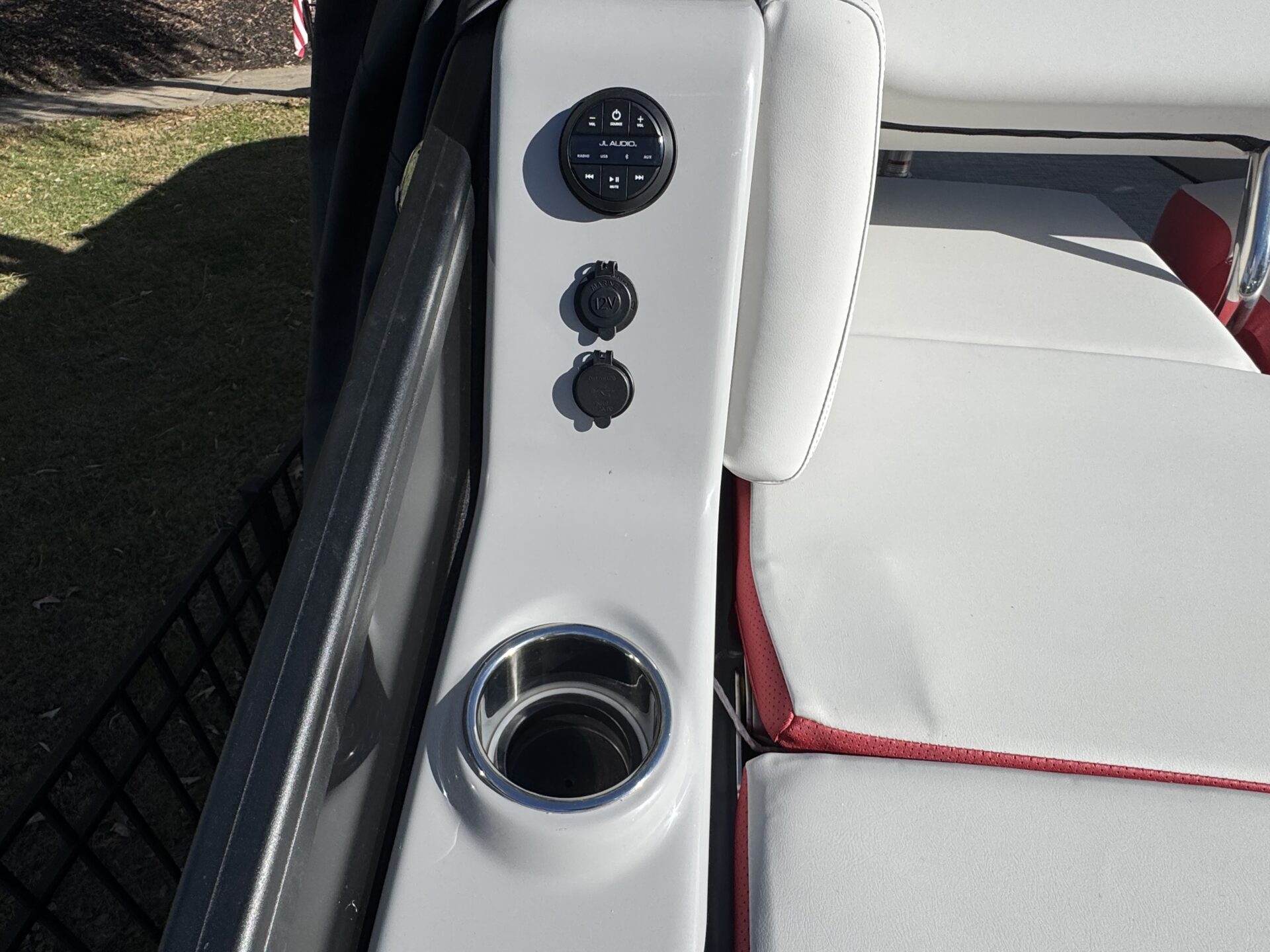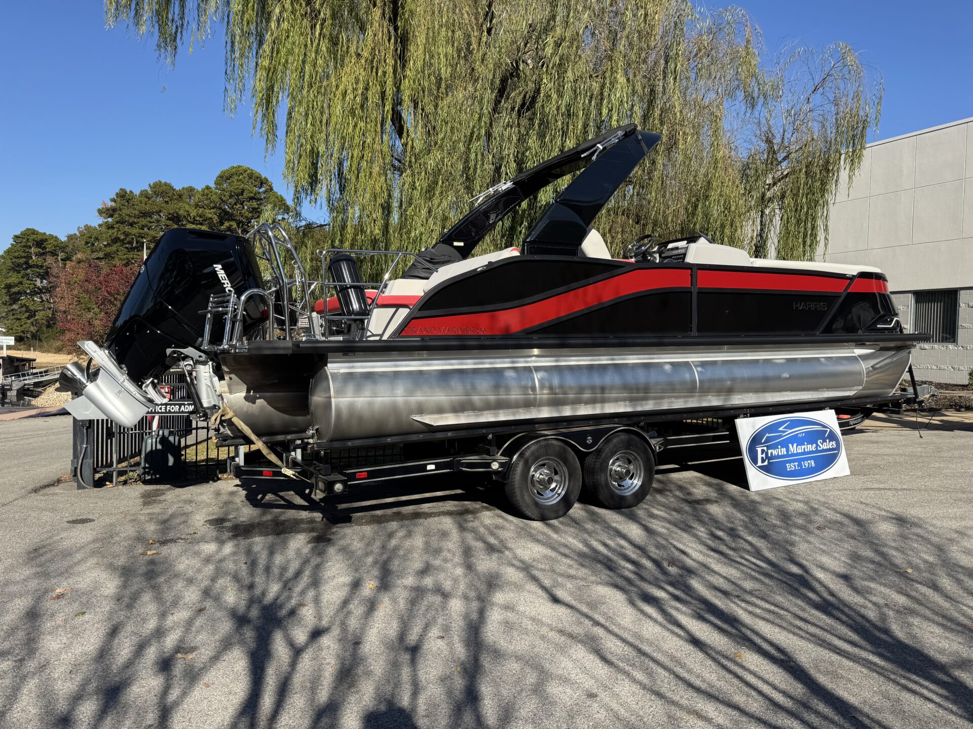 Black Sapphire Fencing with Blush Red Accent; Black Rail Package; SLDH Layout; Moonlight Gray Pillowtop with Crimson Accent; 350l V-10 Mercury; 325 Chassis with 25″ Outside Pontoons and 27″ Center Pontoon; Center Floor Storage; SS Ski Tow Bar; ION Power Lift Tower with Black Bimini Top; Total Light Package with *C-Zone*; Convenience Package; 4 Step Telescoping Swim Ladder; Sterling Gray Woven Vinyl Flooring; SIMRAD NSX9 Glass Dash Screen; Raised Helm; Removable Windscreen; JL Platinum Stereo Upgrade with 8 Speakers & 2 AMPS/SUBS; Canvas individual Seat Covers; Woodgrain Table.