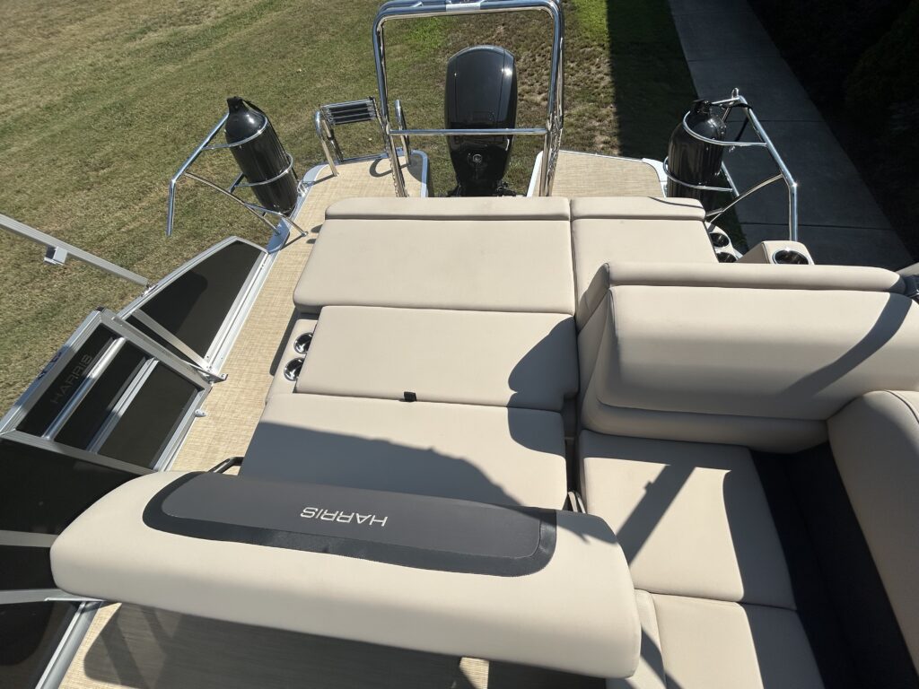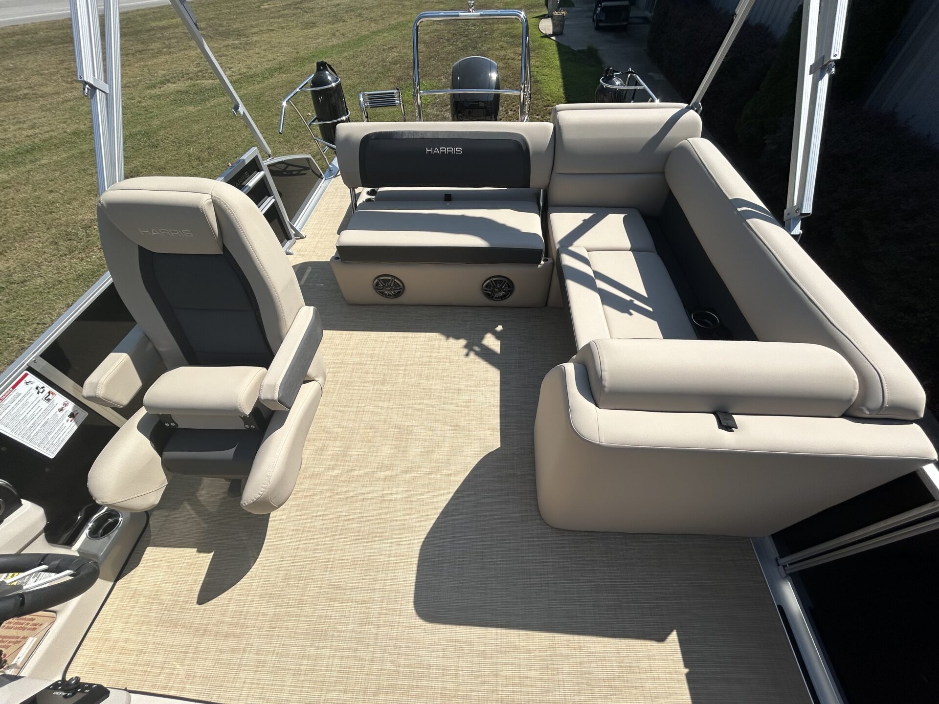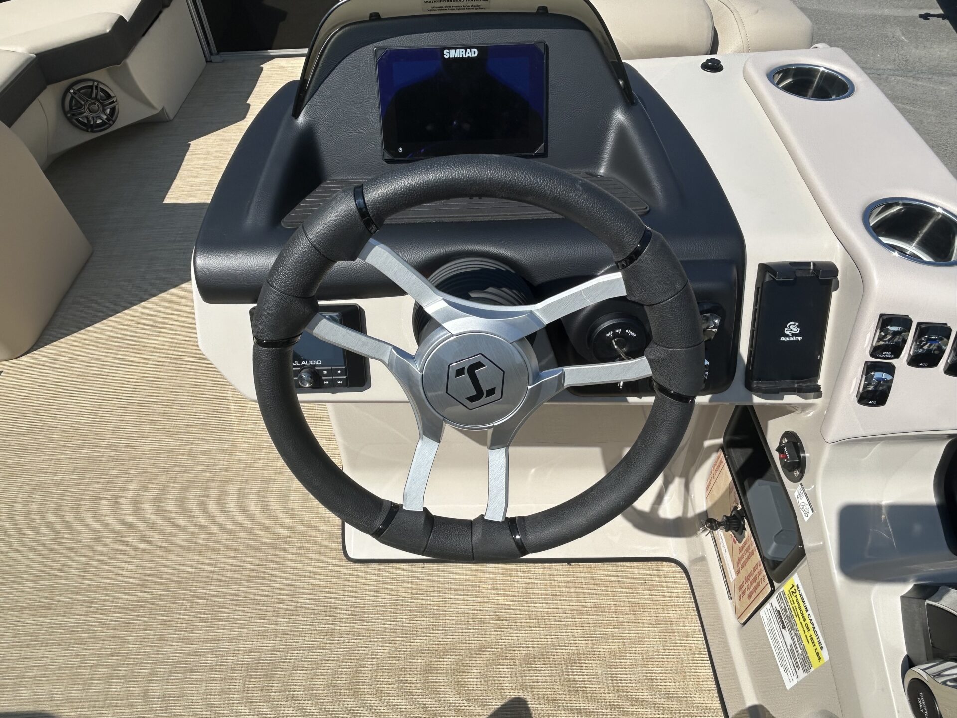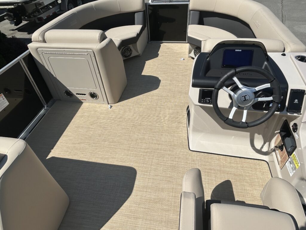 Black Metallic Fencing with Silver Rails and Dune SL Interior Layout; Desert Beige Sea Grass Flooring; Mercy 150hp 4 Stroke with Hydraulic Steering and SS Prop; Bimini Top; 325 Triple Pontoon Chassis; Tech Package 1 with 7″ Simrad Screen, Lighting Package, JL Stereo Upgrade and Wireless Phone Charger; Lockable Glovebox; Aft Safety Rails w/Fender Storage; Flip Up Chaise End Table; Standard Cockpit Table; 4 Step SS Swim Ladder; SS Ski Tow Bar.