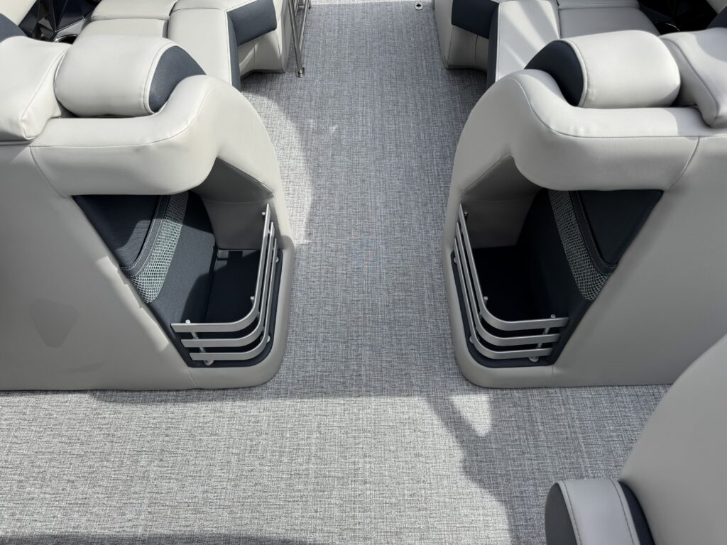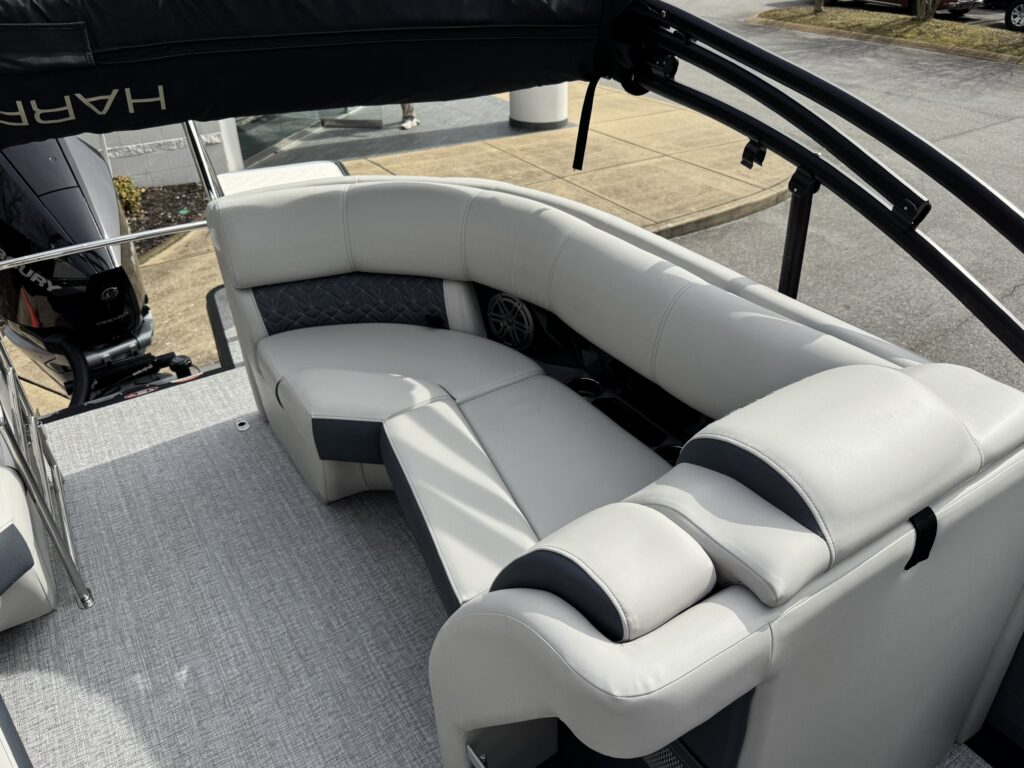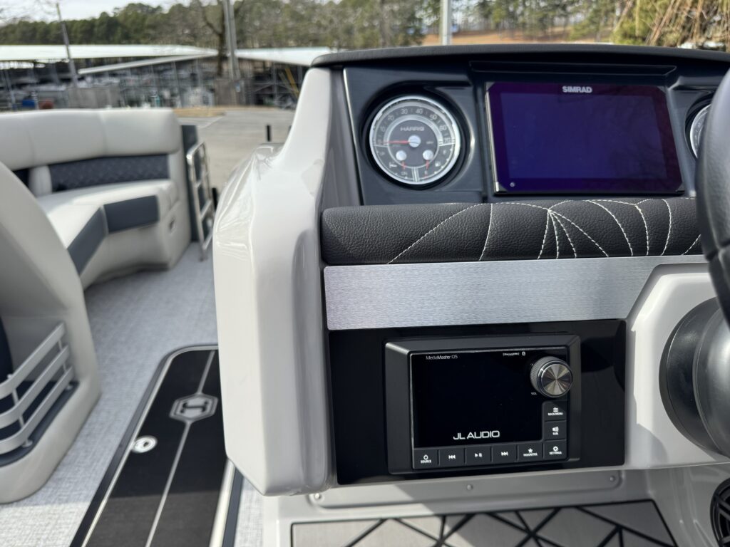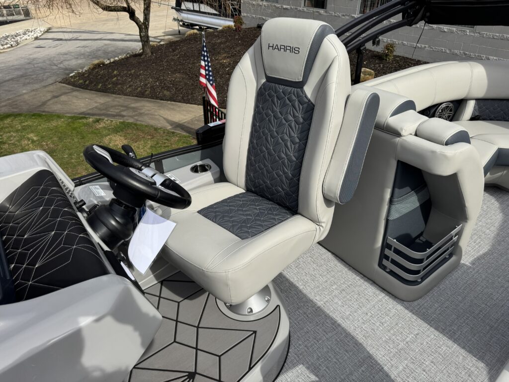 This is a Custom Grand Mariner 230 that is built on the 325RPM Chassis and Powered by a 300HP Mercury with Power Assisted Steering and DTS. It features the Center Walk Thru with Dual Helm Chairs and is Sterling Gray with Blush Red Accent and Black Rail Package. It is equipped with Contour Electric Bimini Top; Tungsten Pillowtop Furniture with Charcoal Accent; Salt Water Anodes; Deluxe Tech Package #1; Stone Gray Woven Vinyl Flooring; Simrad NSX9 Display; JL Sound System; 2 Additional Fenders; Aft SST Swim Step; Chaise End Flip Up Table.