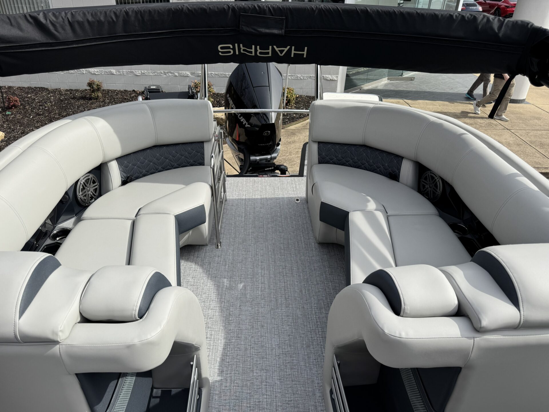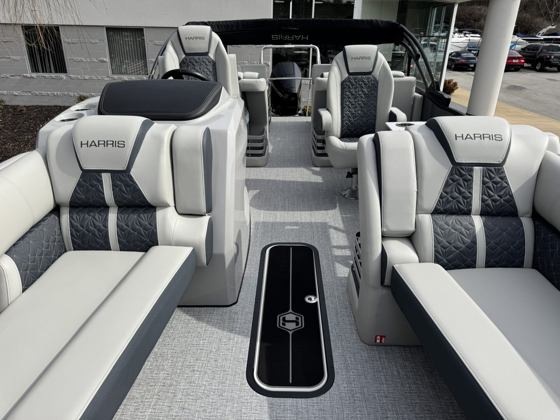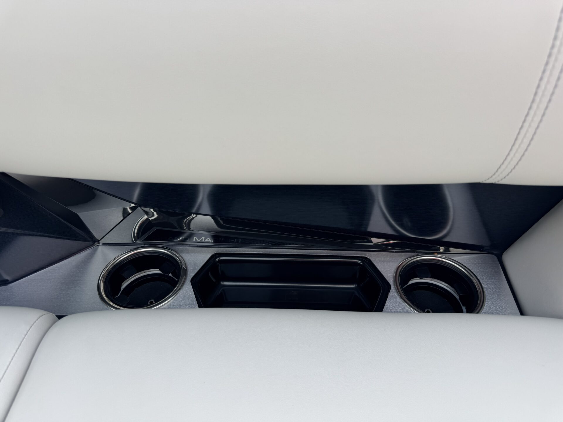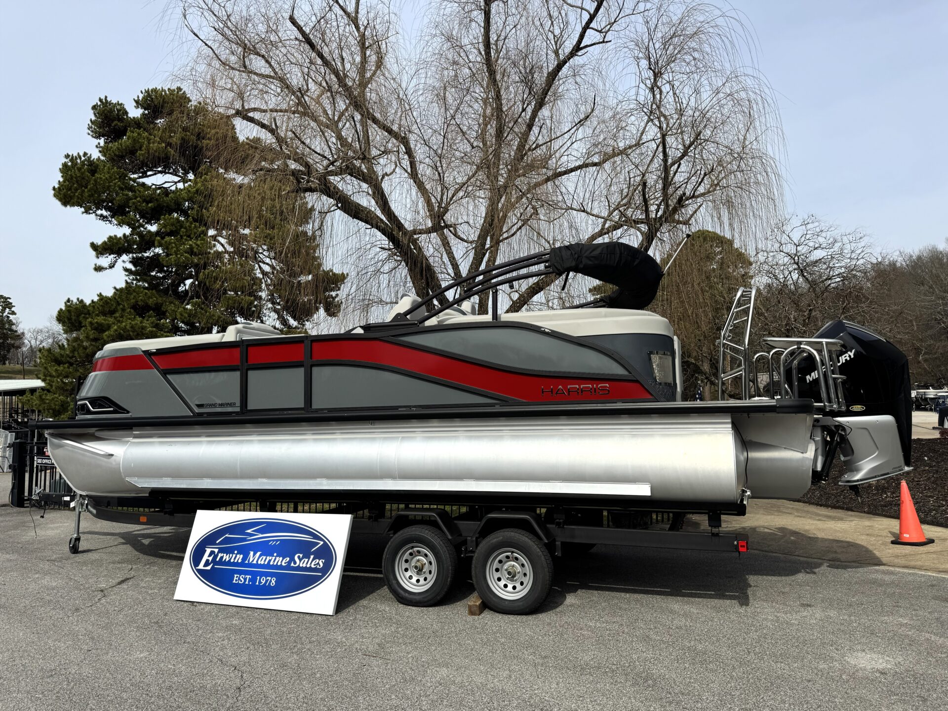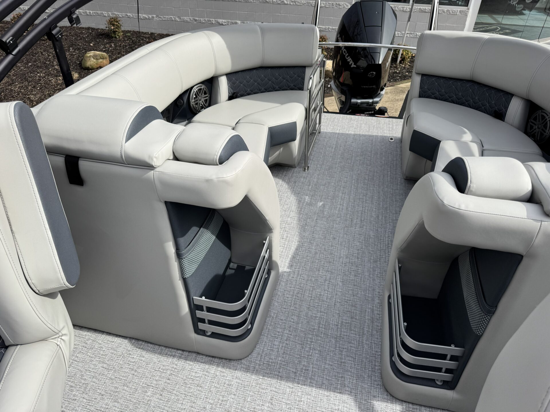 This is a Custom Grand Mariner 230 that is built on the 325RPM Chassis and Powered by a 300HP Mercury with Power Assisted Steering and DTS. It features the Center Walk Thru with Dual Helm Chairs and is Sterling Gray with Blush Red Accent and Black Rail Package. It is equipped with Contour Electric Bimini Top; Tungsten Pillowtop Furniture with Charcoal Accent; Salt Water Anodes; Deluxe Tech Package #1; Stone Gray Woven Vinyl Flooring; Simrad NSX9 Display; JL Sound System; 2 Additional Fenders; Aft SST Swim Step; Chaise End Flip Up Table.