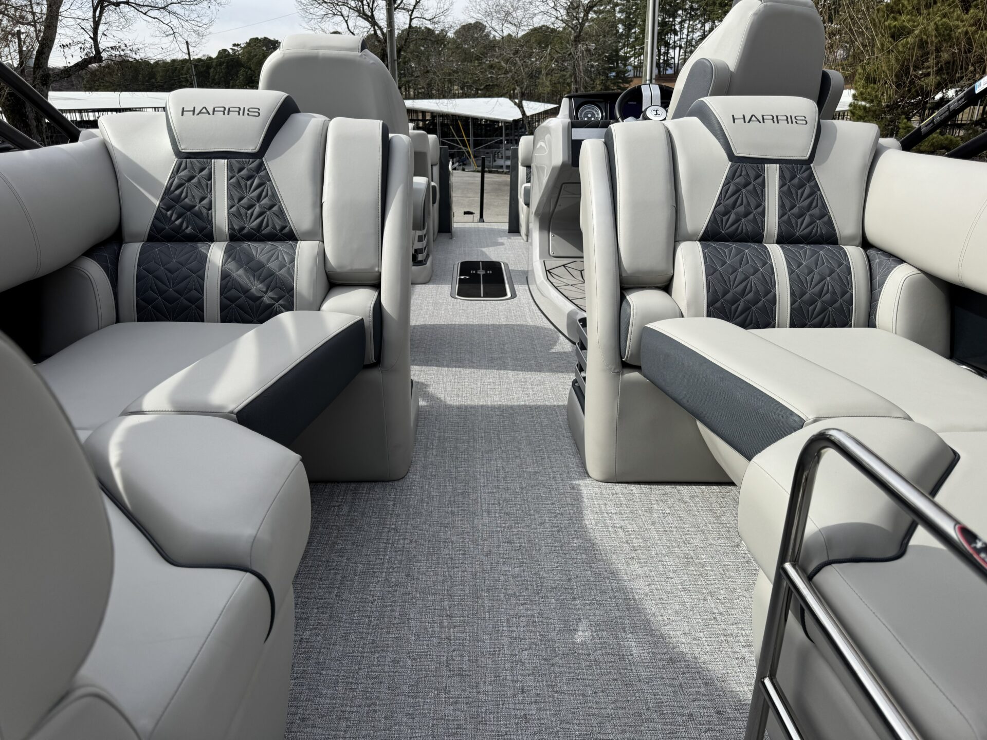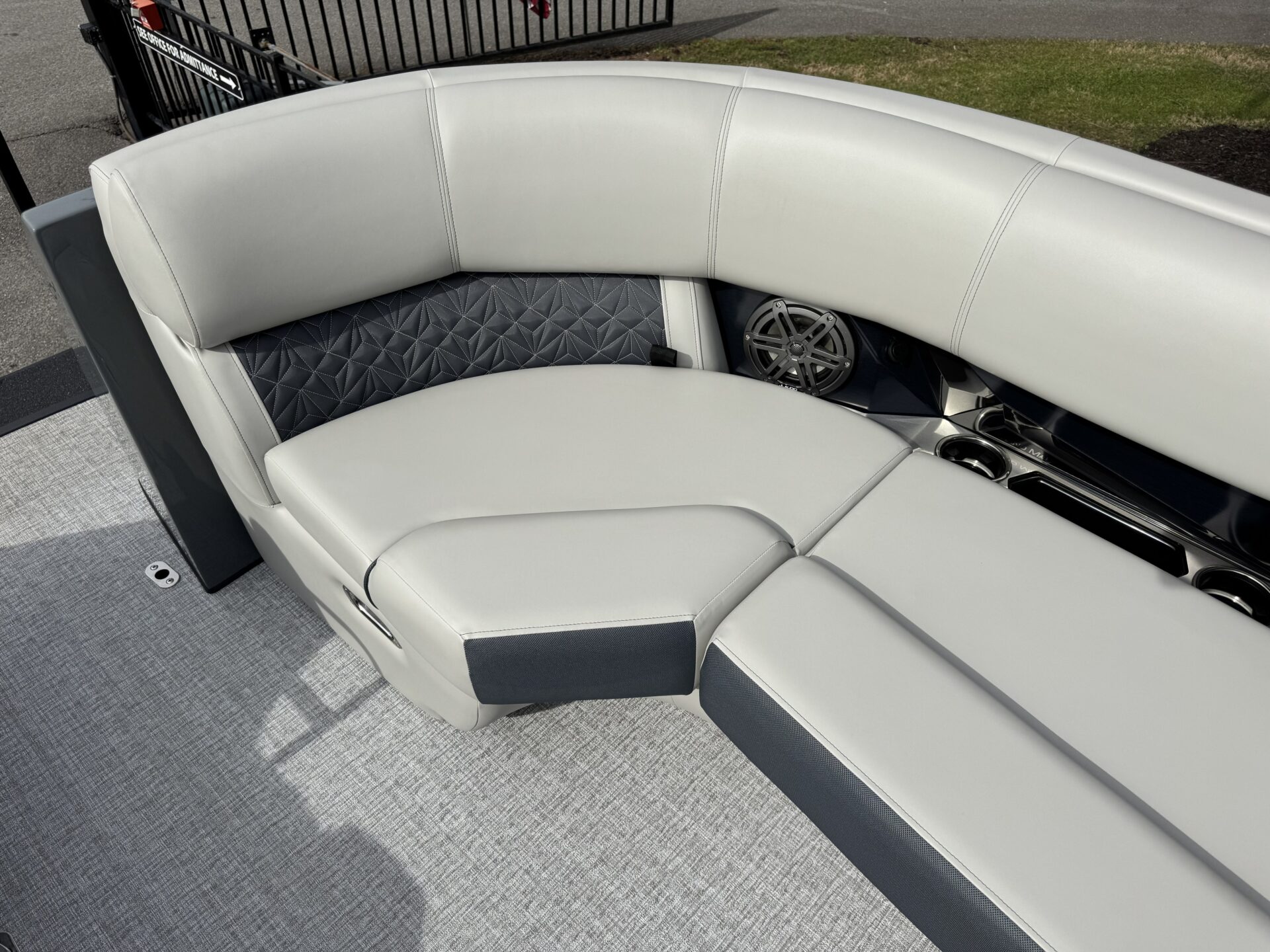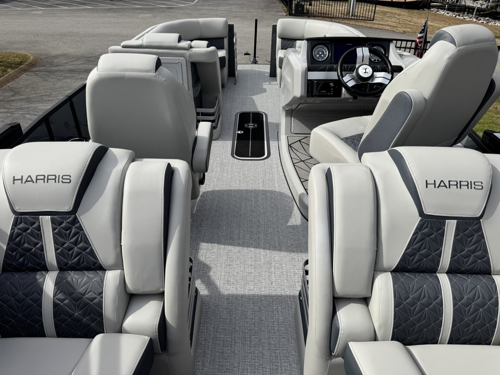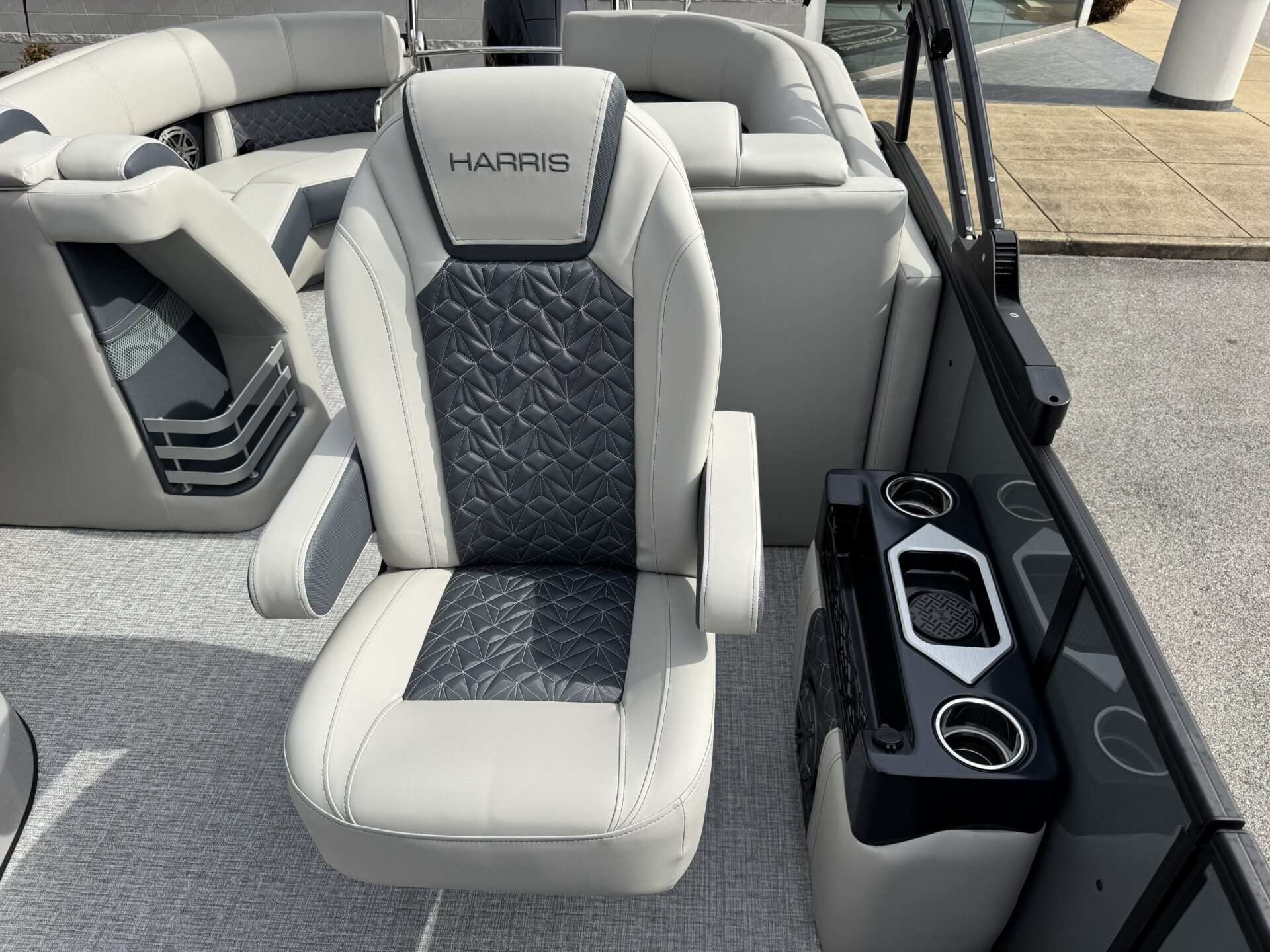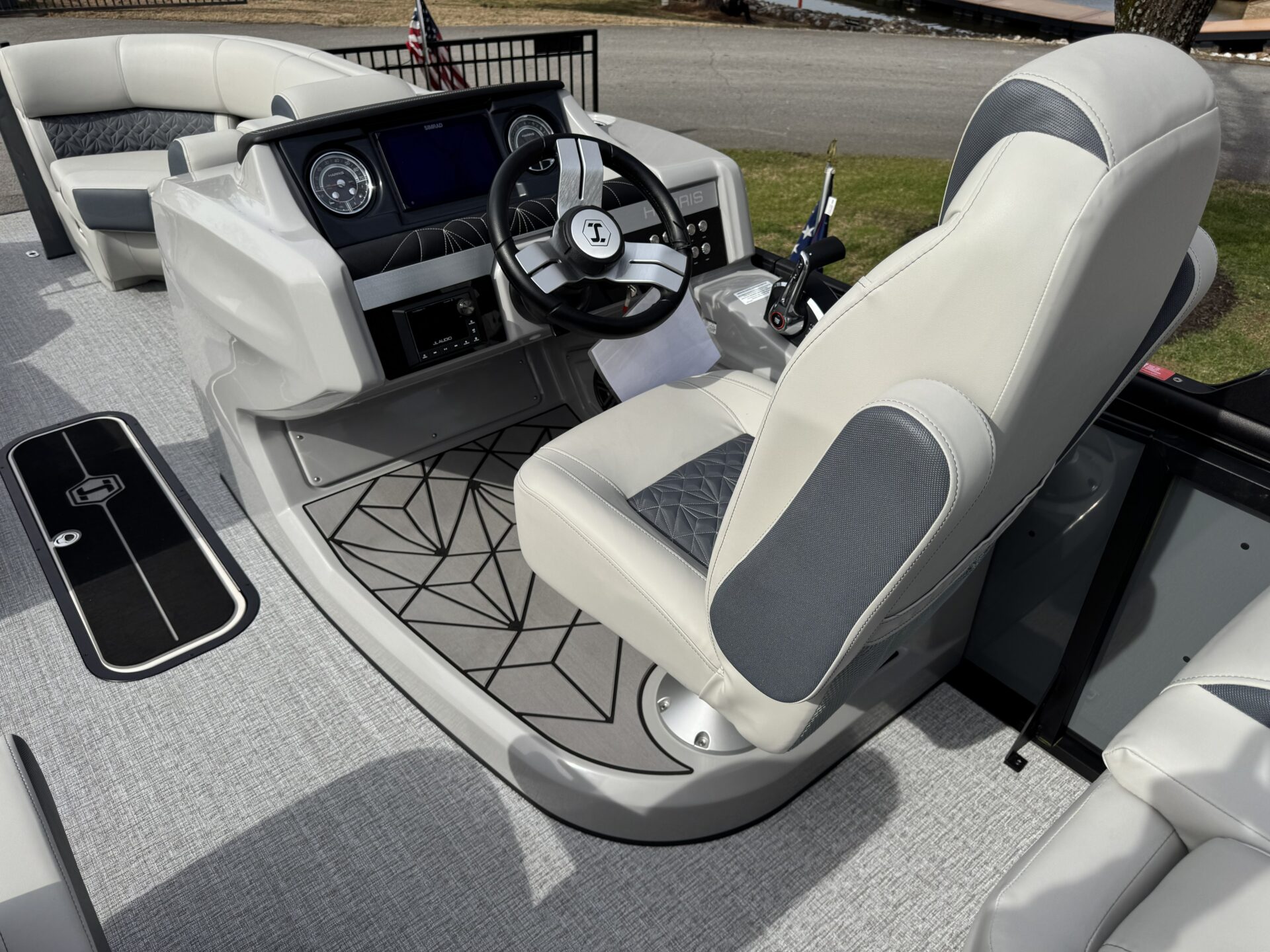 This is a Custom Grand Mariner 230 that is built on the 325RPM Chassis and Powered by a 300HP Mercury with Power Assisted Steering and DTS. It features the Center Walk Thru with Dual Helm Chairs and is Sterling Gray with Blush Red Accent and Black Rail Package. It is equipped with Contour Electric Bimini Top; Tungsten Pillowtop Furniture with Charcoal Accent; Salt Water Anodes; Deluxe Tech Package #1; Stone Gray Woven Vinyl Flooring; Simrad NSX9 Display; JL Sound System; 2 Additional Fenders; Aft SST Swim Step; Chaise End Flip Up Table.