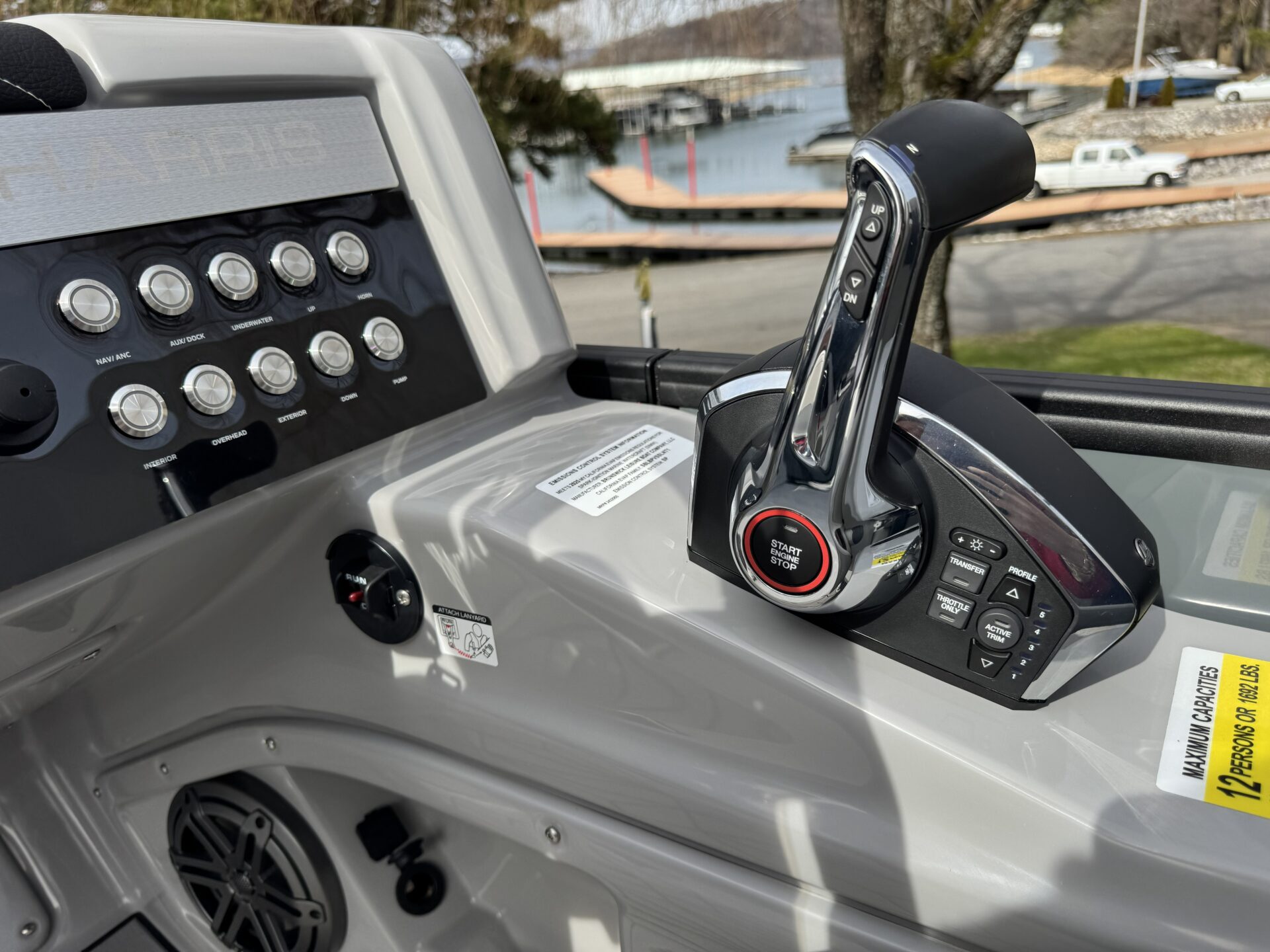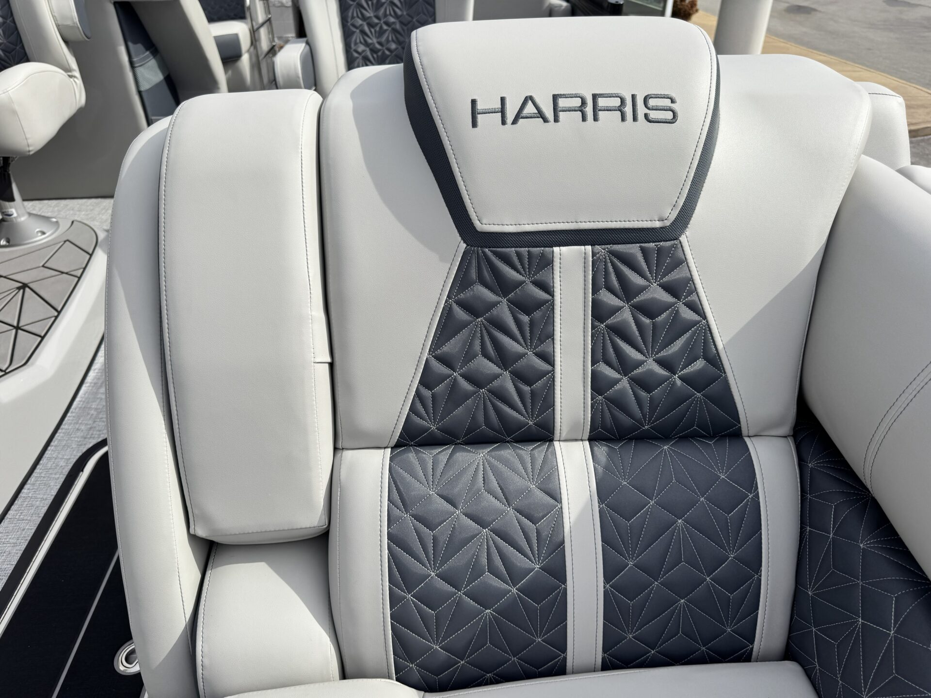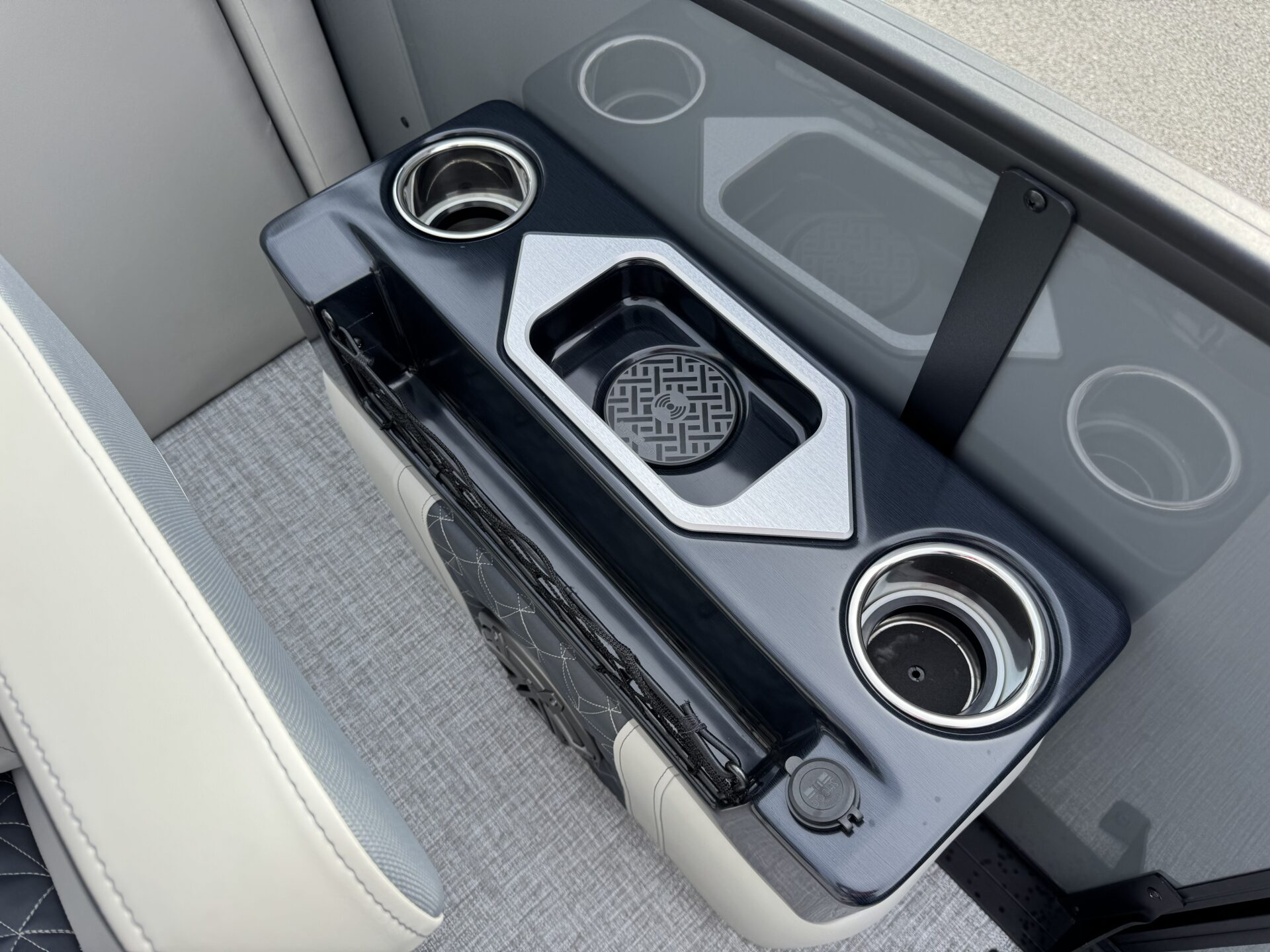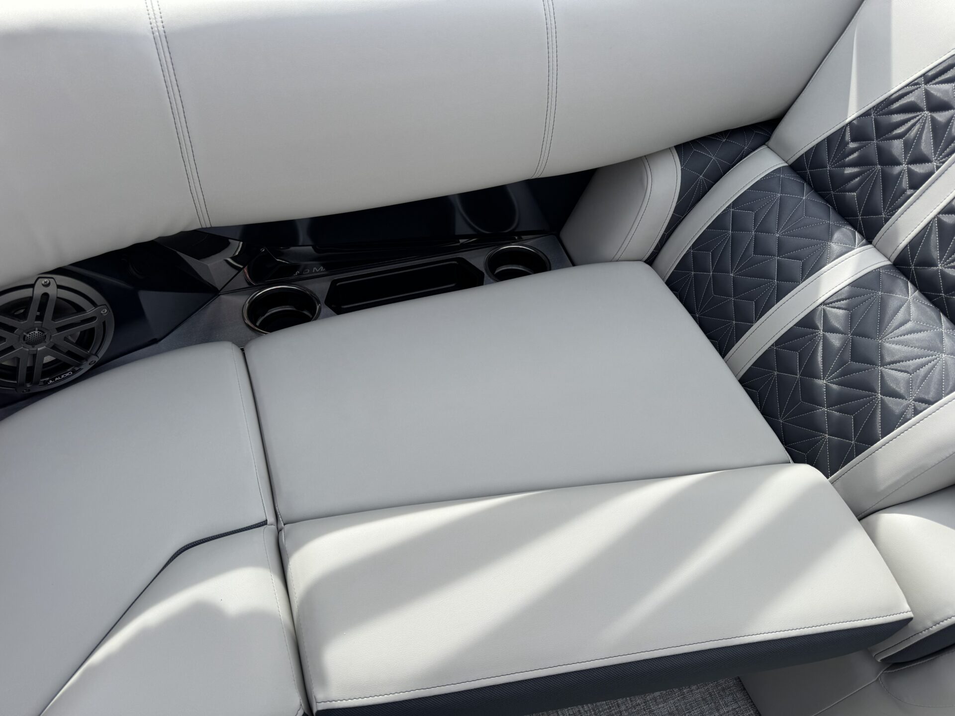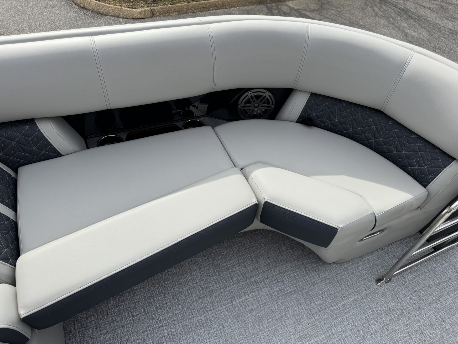 This is a Custom Grand Mariner 230 that is built on the 325RPM Chassis and Powered by a 300HP Mercury with Power Assisted Steering and DTS. It features the Center Walk Thru with Dual Helm Chairs and is Sterling Gray with Blush Red Accent and Black Rail Package. It is equipped with Contour Electric Bimini Top; Tungsten Pillowtop Furniture with Charcoal Accent; Salt Water Anodes; Deluxe Tech Package #1; Stone Gray Woven Vinyl Flooring; Simrad NSX9 Display; JL Sound System; 2 Additional Fenders; Aft SST Swim Step; Chaise End Flip Up Table.