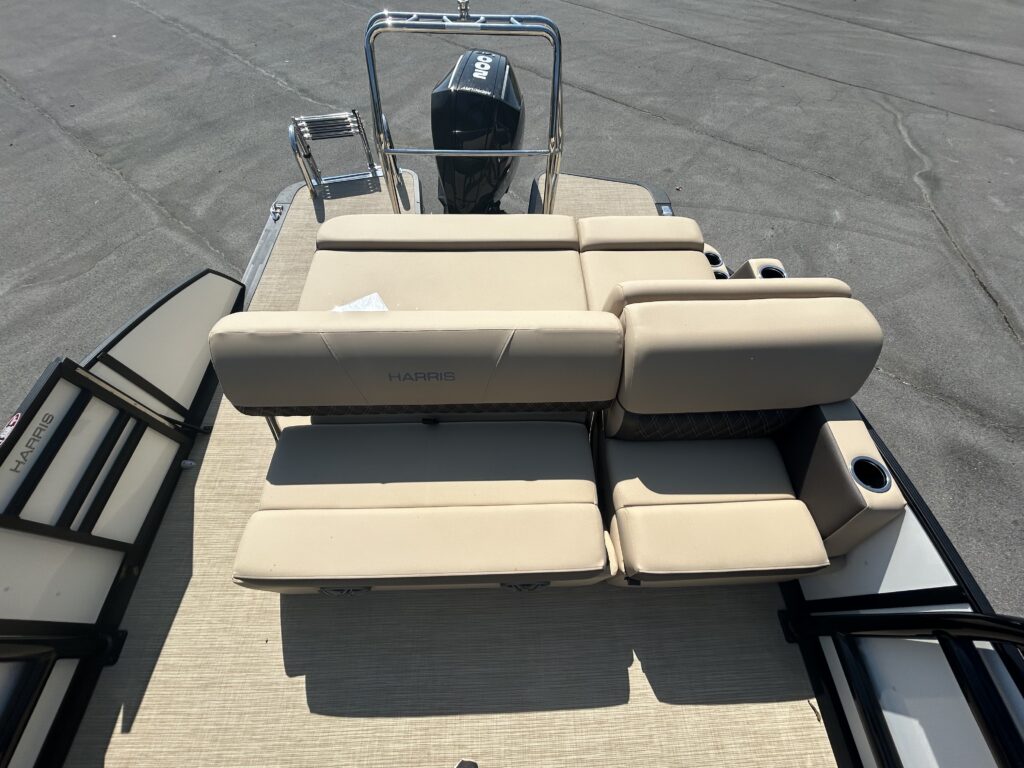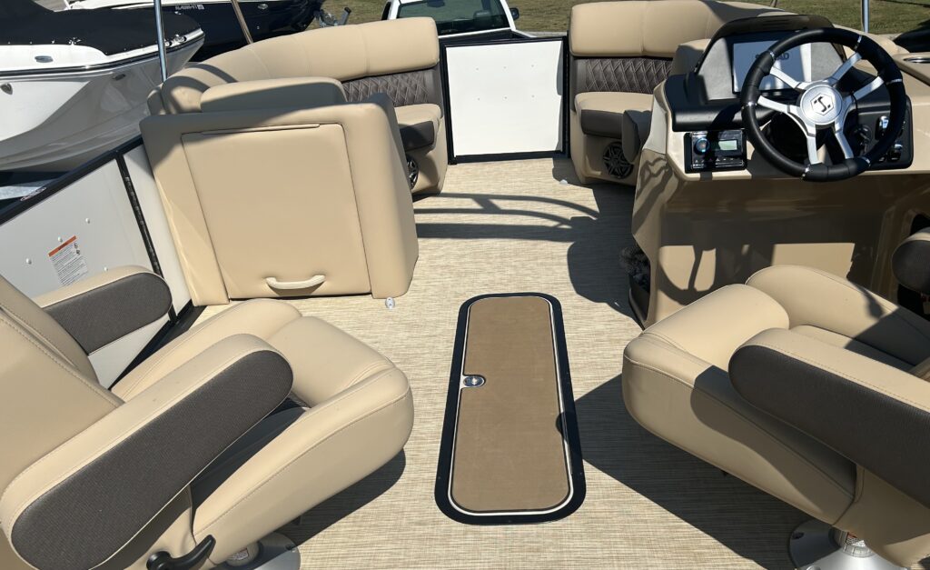 Ceramic White Fencing with Matte Black Accent; Black Edition Powder Coat Fence Rails; Beach Tan Pillow Top Interior with Single Lounge Dual Helm Layout; Desert Beige Sea Grass Flooring; 325 RPM Chassis; In Floor Storage; Sport Arch with Double Bimini Top; Ski tow Bar; Dual Helm Seats with Flip Up Bolster Seating; Clarion Stereo with 4 Speakers; Simrad NSX7 GPS/Display;