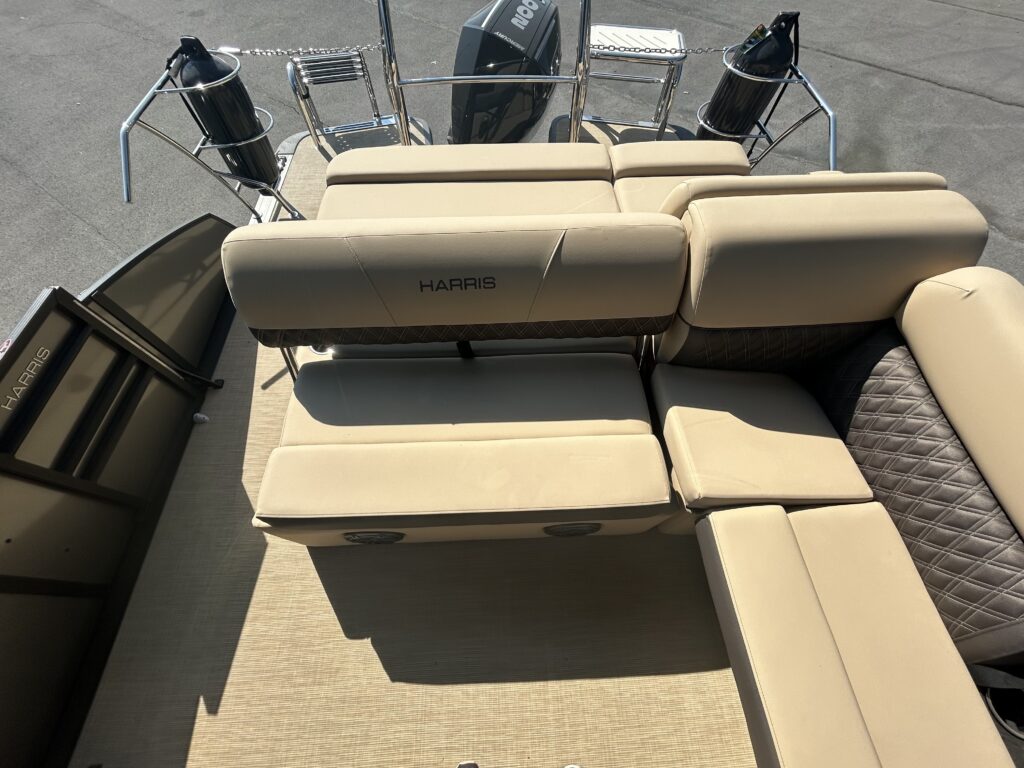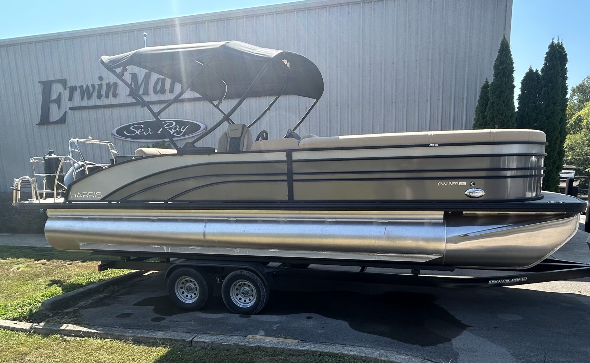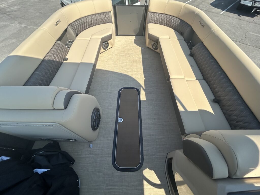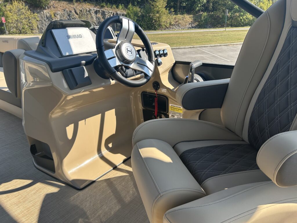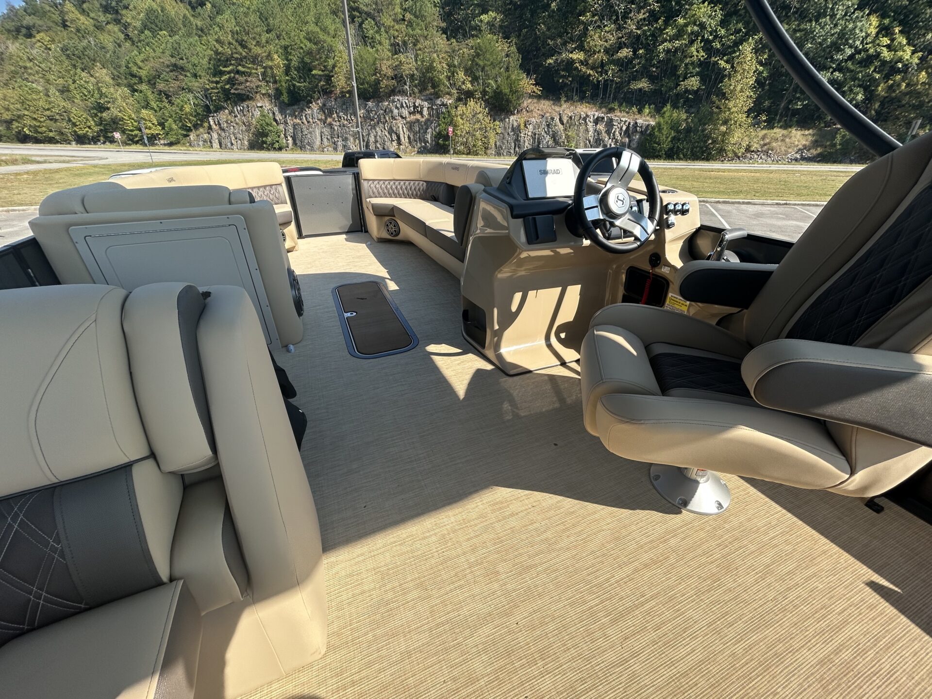 Sterling Gray Metallic Fencing with Silver Accent; Black Rails; Beach Tan Interior; Desert Beige Sea Grass Flooring; 200l PAS/DTS Mercury Engine; 325 Triple Pontoon Chassis; In Floor Storage; Contour Power Bimini Top; Tech Package 2 with 2 9″ Simrad Screens; JL Diamond Audio System; Convenience Package; Interior Lighting Package; Helm Seat with Flip Up Bolster; Wireless Phone Charger; Aft Swim Seat; Aft Safety Rails; Chaise End Flip Up Table; Woodgrain Cockpit Table.